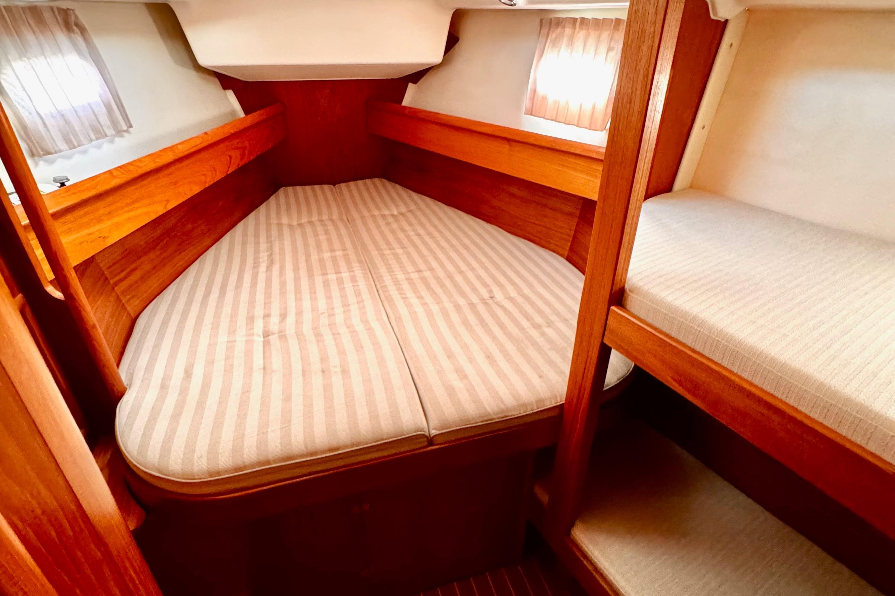 Forward guest cabin with full-size V-berth and two single bunks