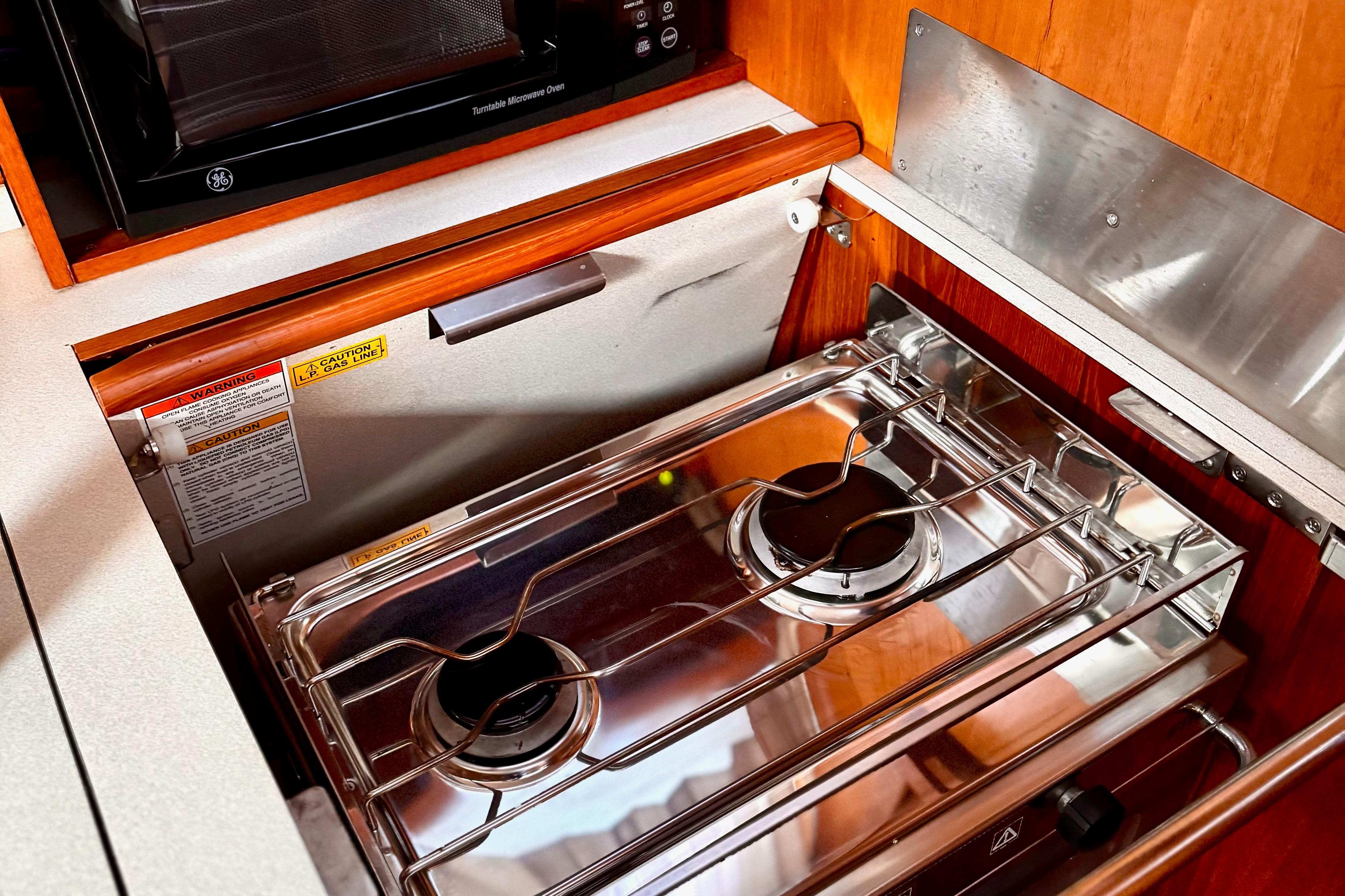 Well-appointed galley – full-size fridge, freezer, and ample storage for long passages
