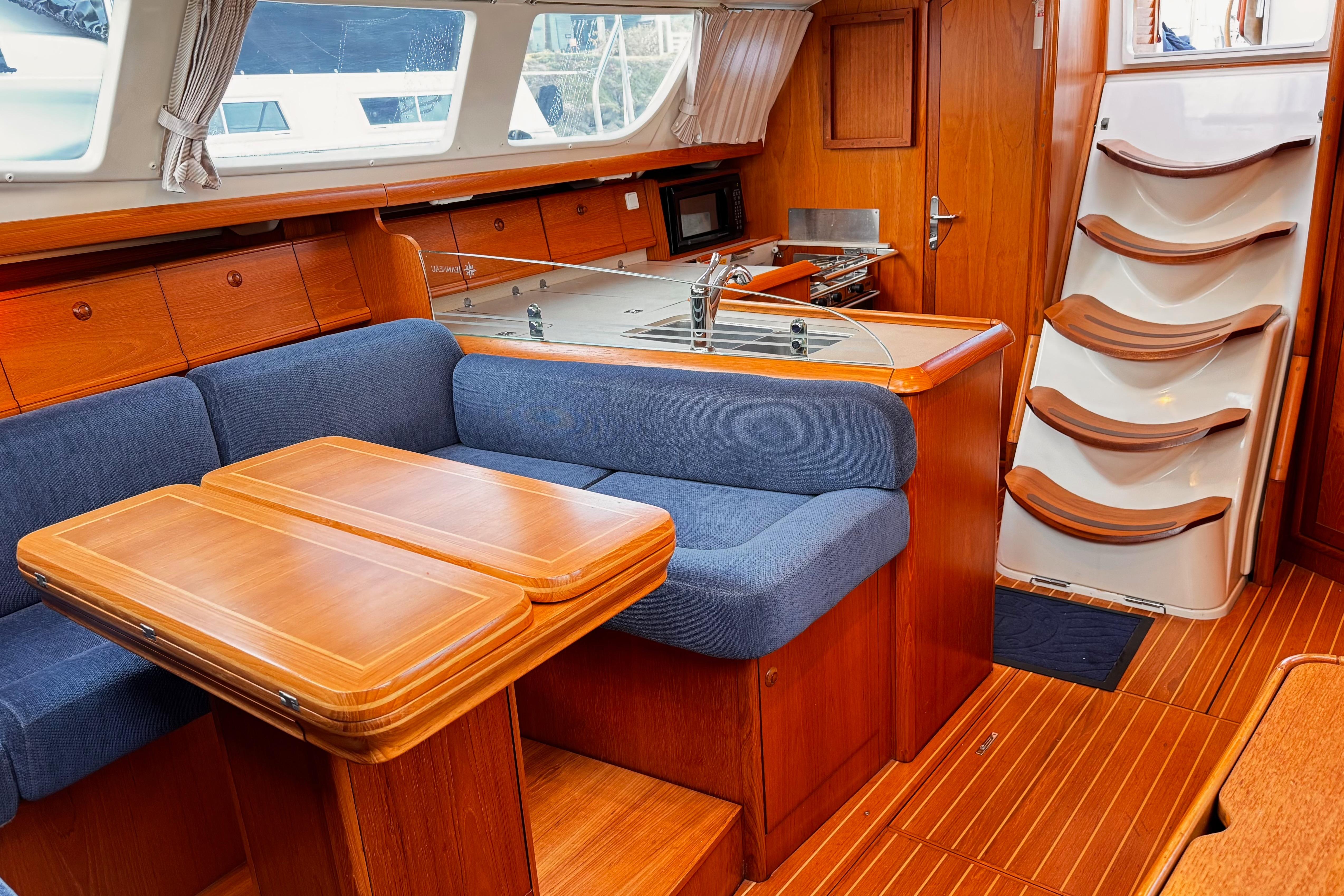 This 2001 Jeanneau 43 Deck Salon is the ideal cruiser for sailors who want performance, comfort, and flexibility. Featuring the preferred 2-cabin / 2-head layout, this model includes a versatile forward stateroom with a full-size V-berth and two additional bunks, perfect for families or hosting guests. With a powerful sail plan, spacious cockpit, and the signature Jeanneau raised salon design, this yacht offers luxurious living at sea or at anchor.