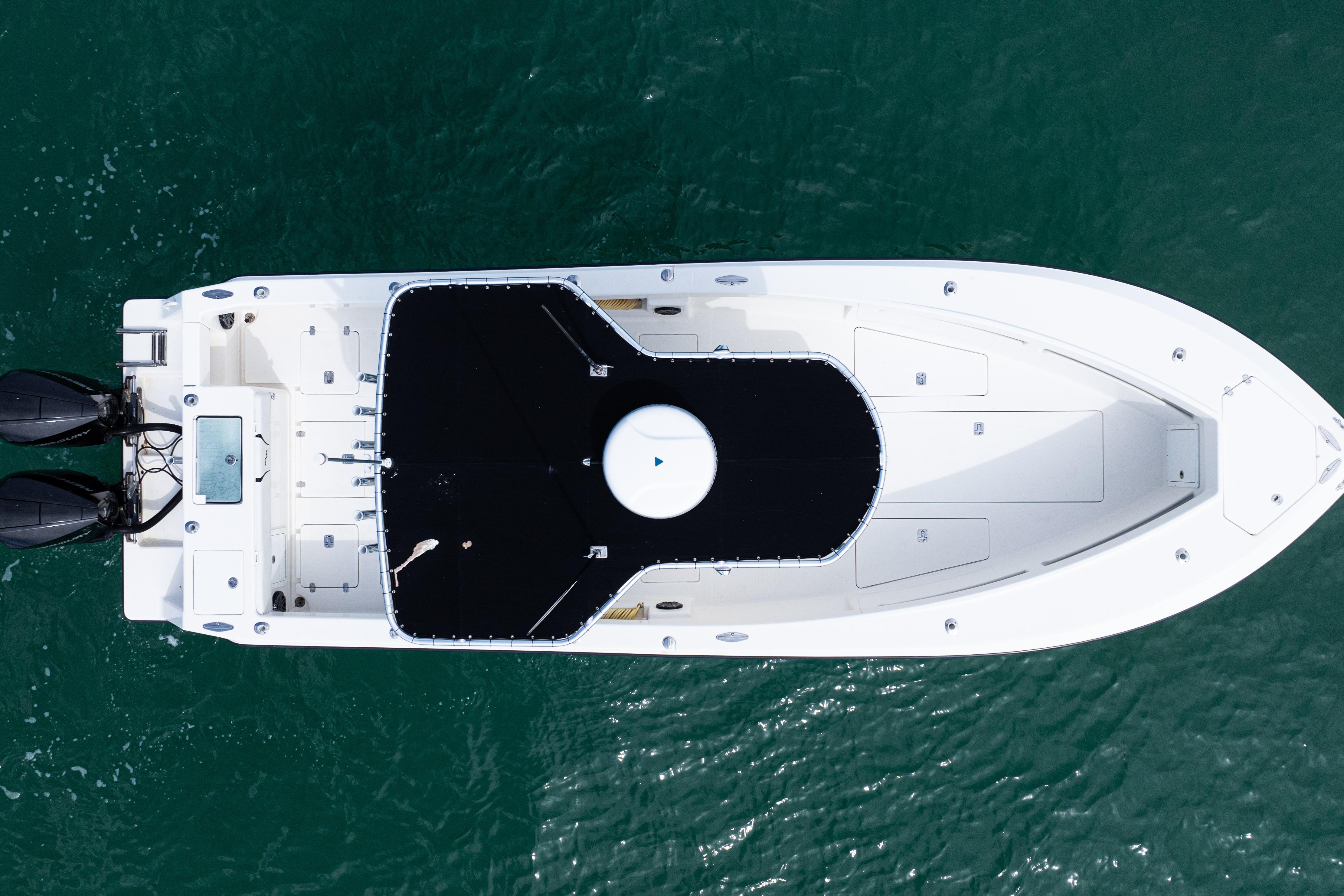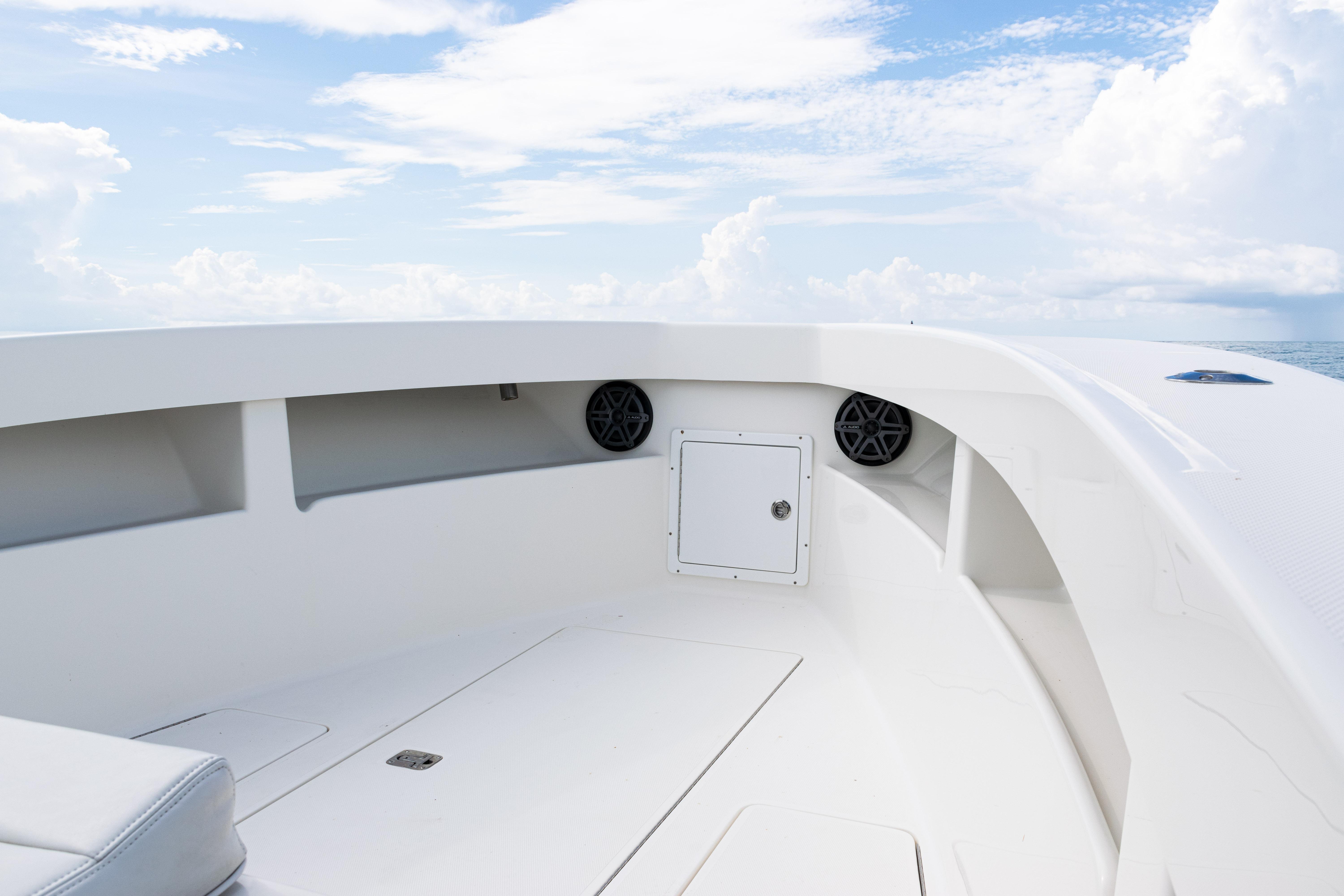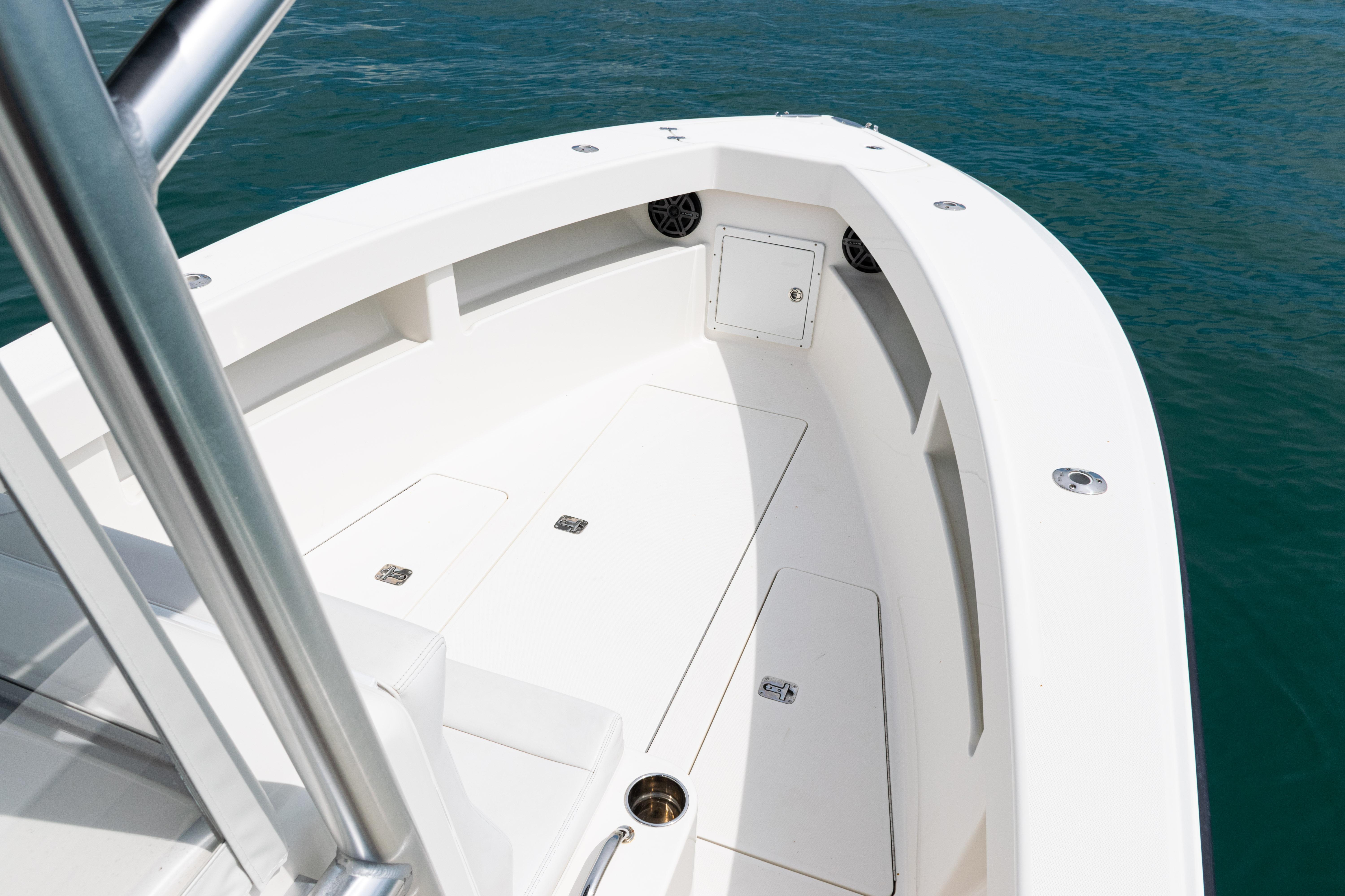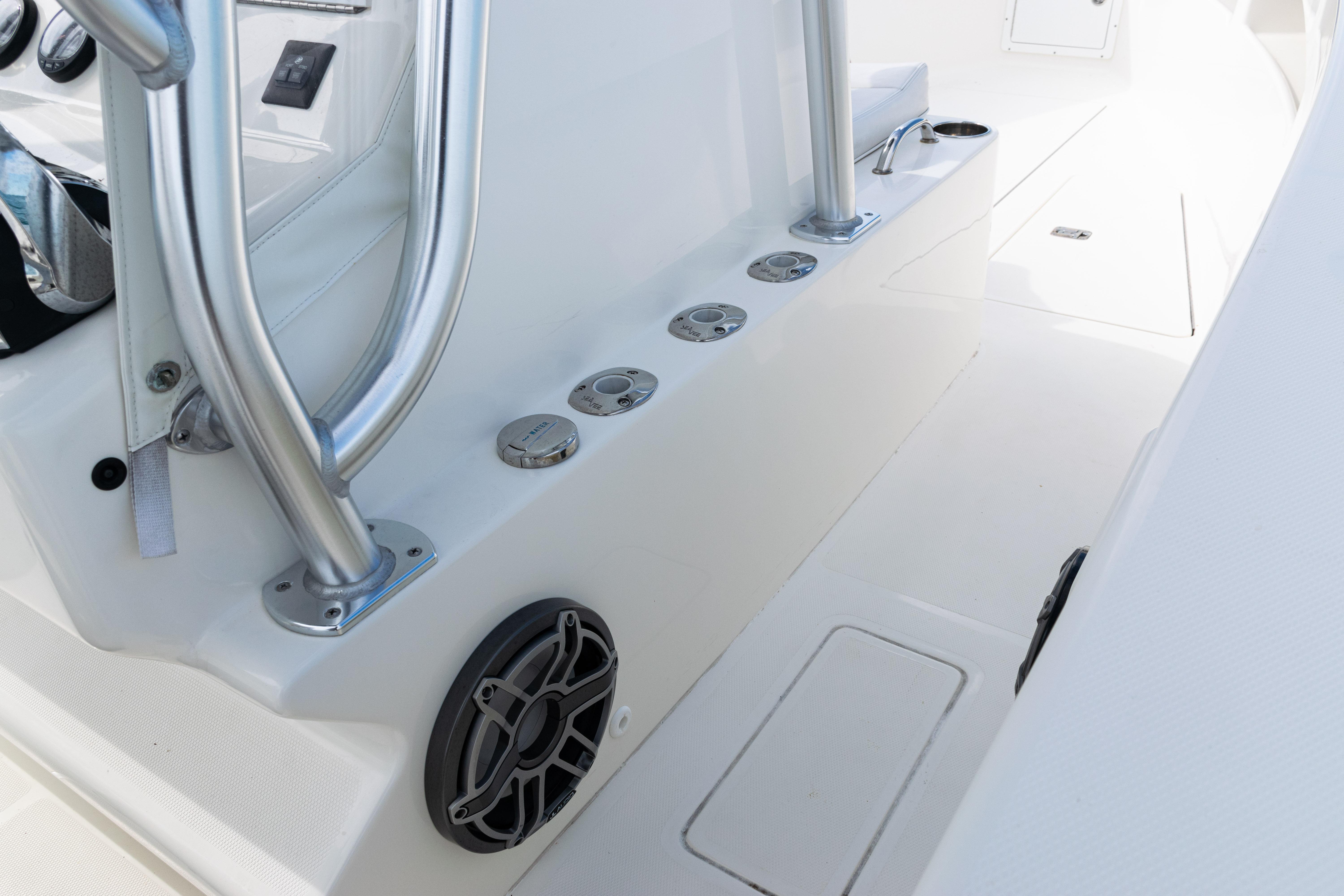Equipped with a KW-style hardtop, full 3-sided polycarbonate console enclosure, and a deluxe leaning post with rod holders, drink holders, and cooler storage, the layout balances comfort and fishability. The cockpit features a transom livewell with clear lid and backup system, plus fresh and raw water washdowns.