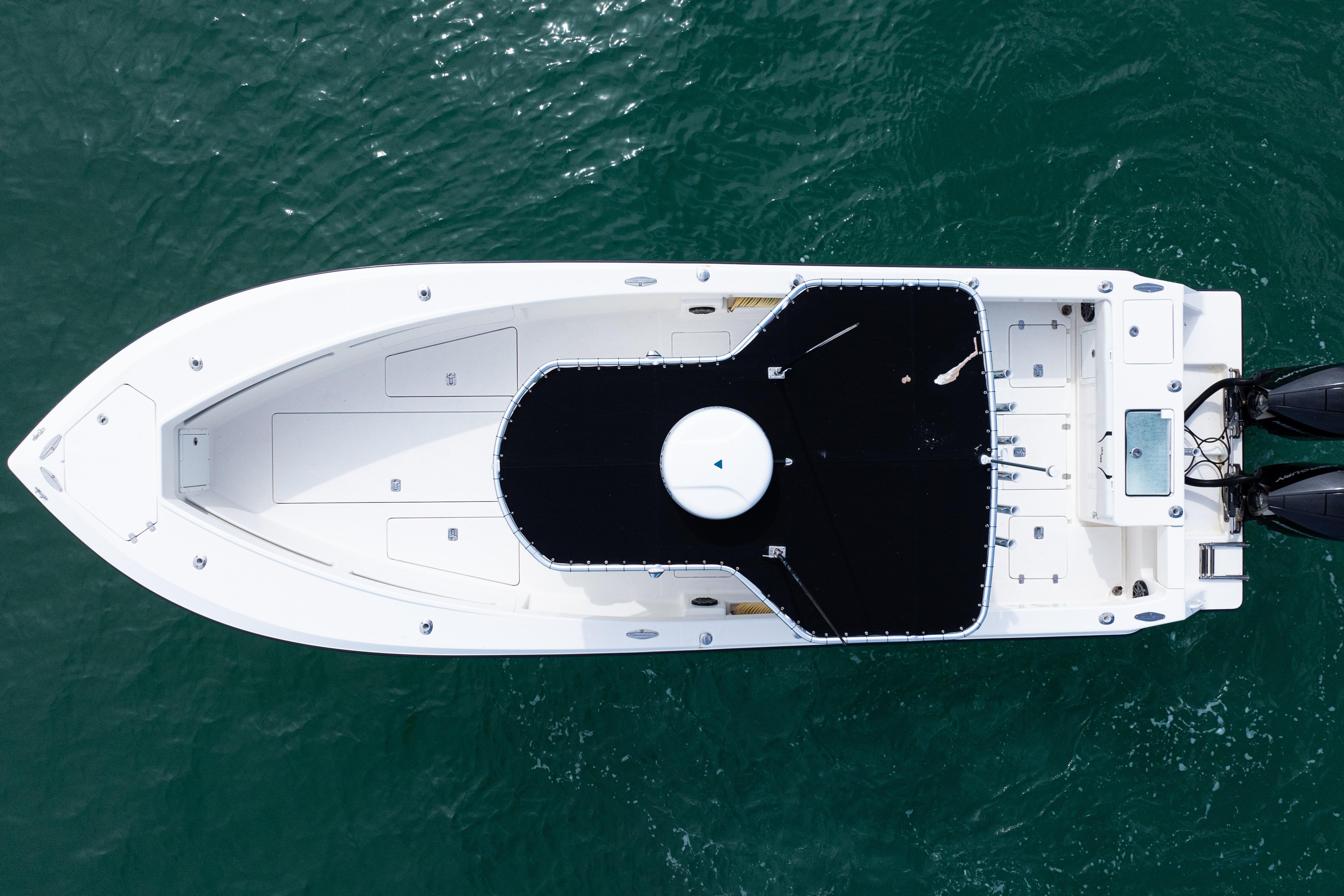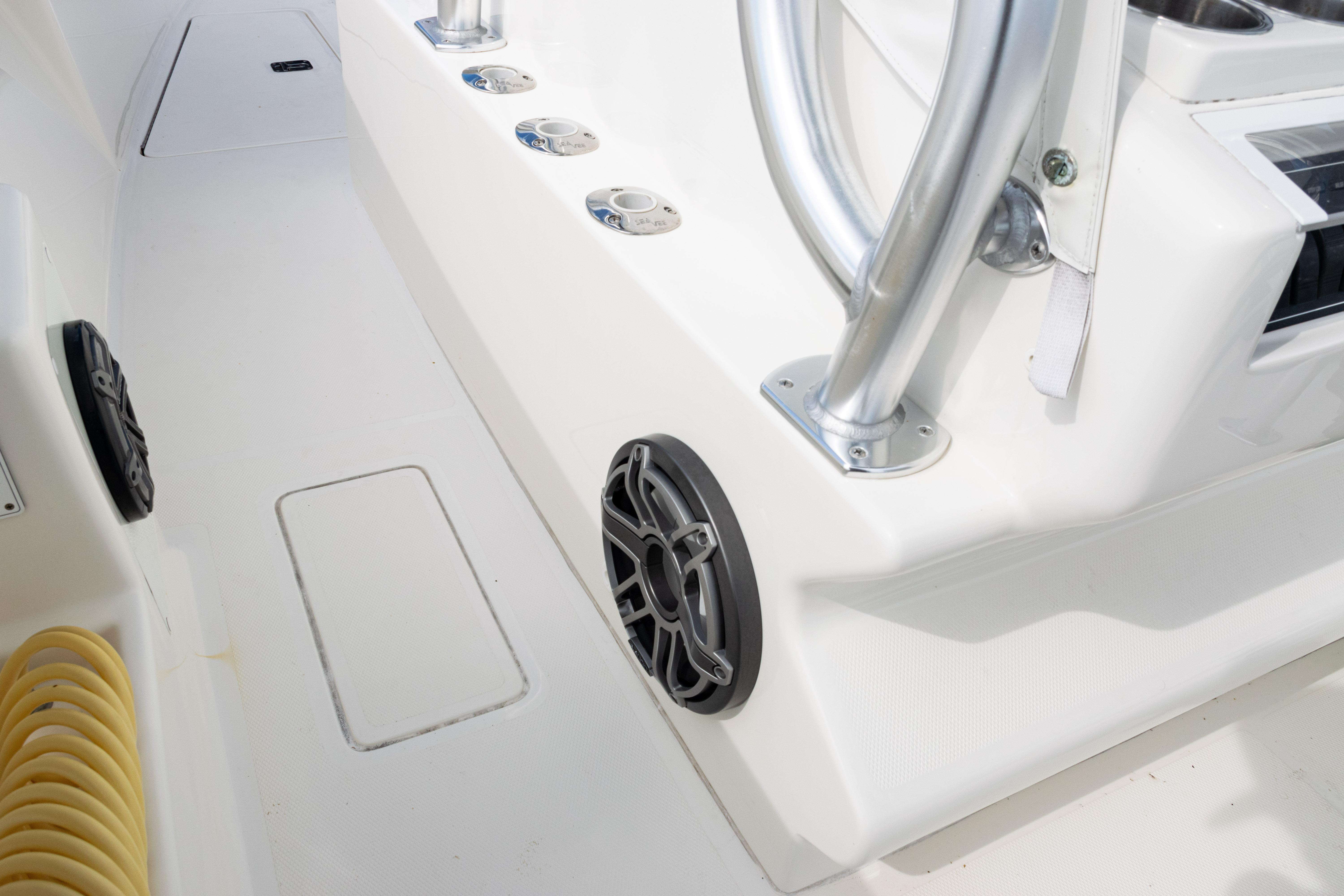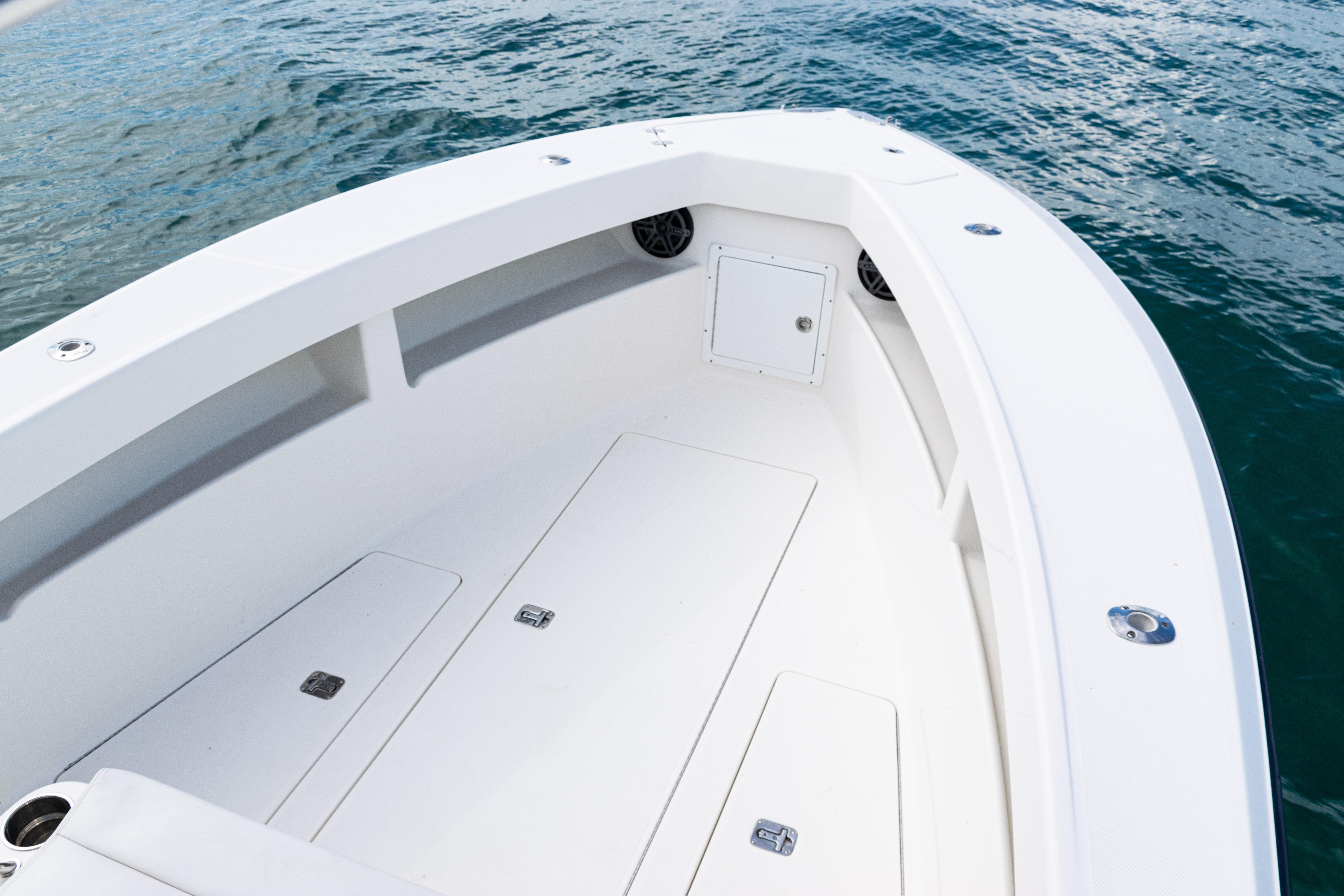 Equipped with a KW-style hardtop, full 3-sided polycarbonate console enclosure, and a deluxe leaning post with rod holders, drink holders, and cooler storage, the layout balances comfort and fishability. The cockpit features a transom livewell with clear lid and backup system, plus fresh and raw water washdowns.