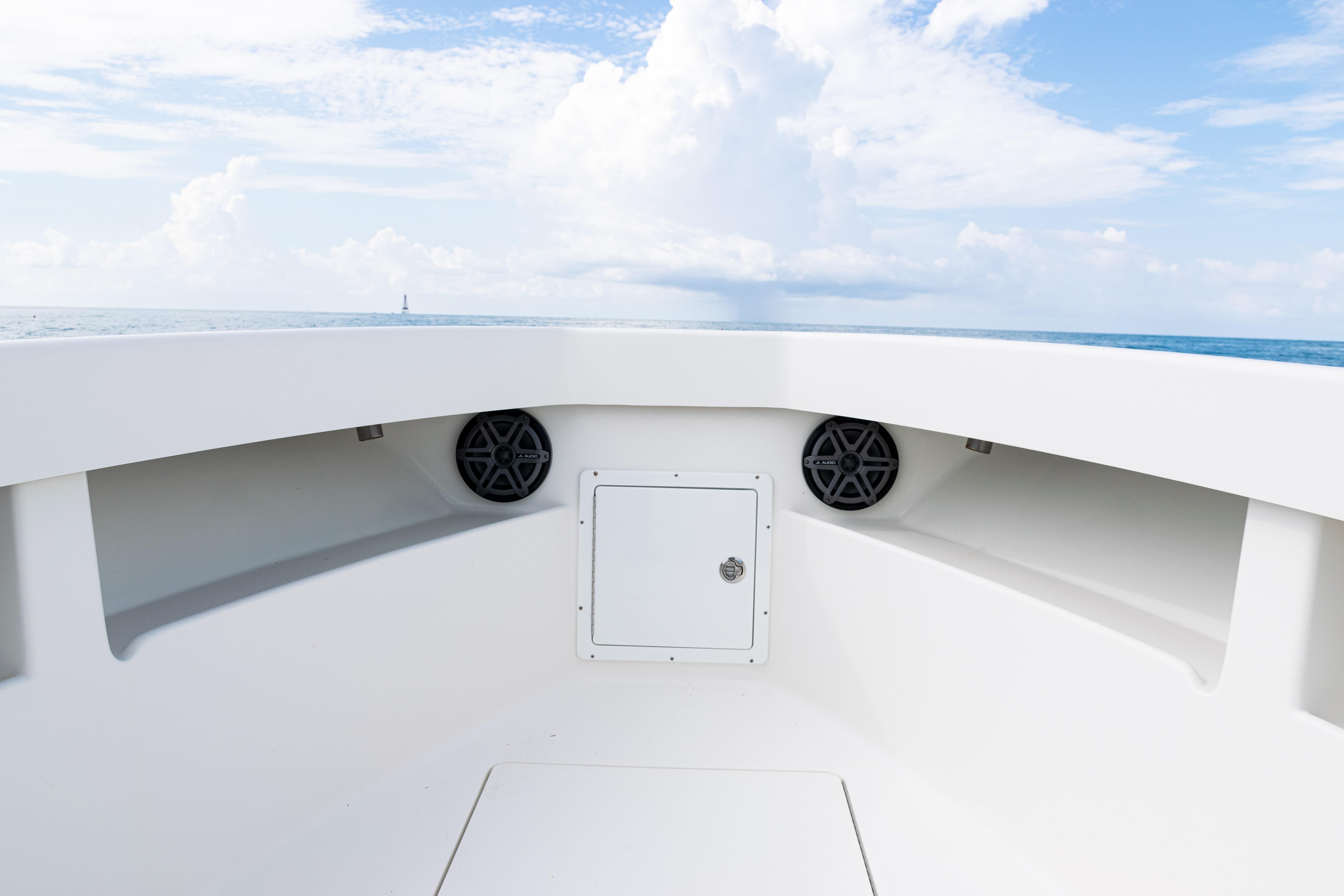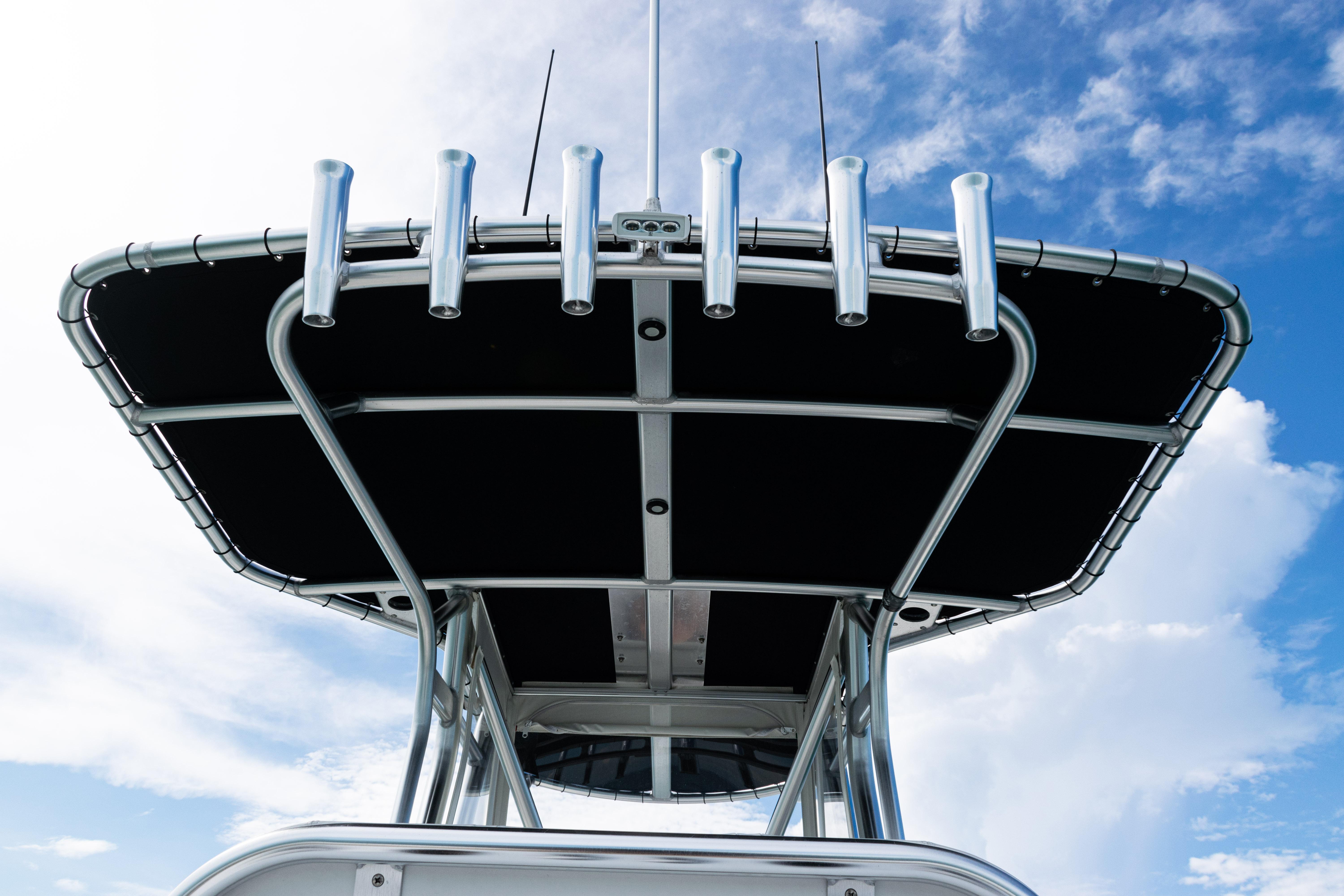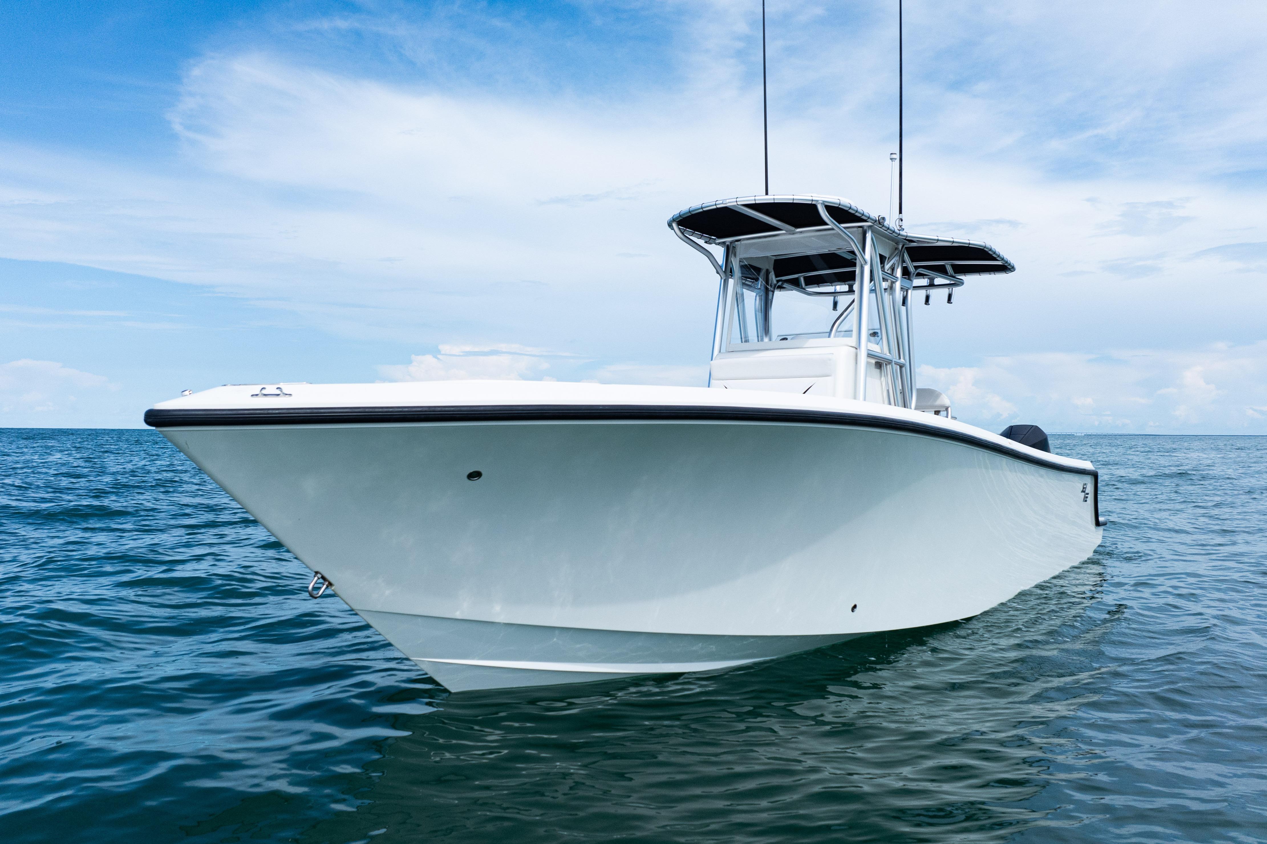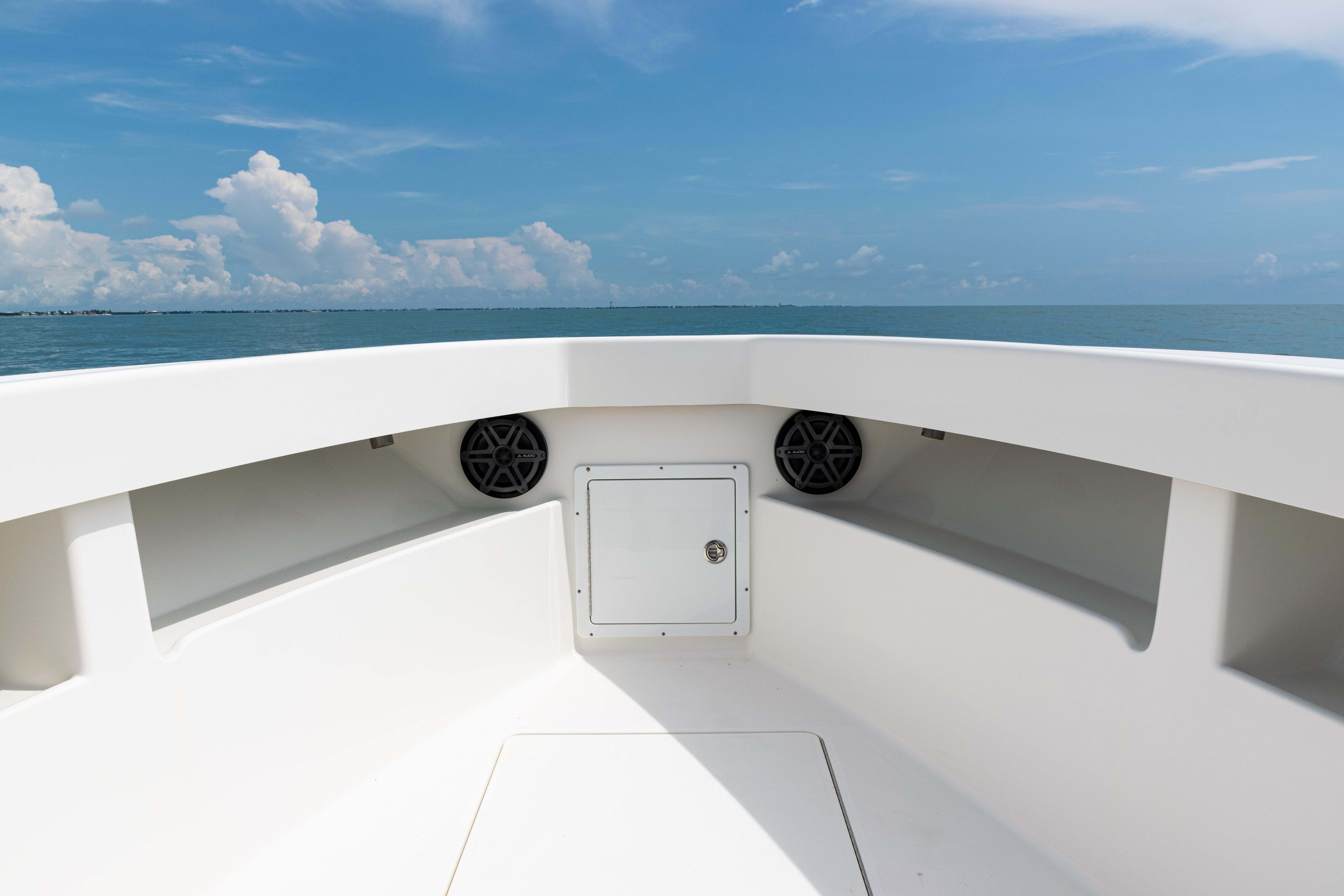 Equipped with a KW-style hardtop, full 3-sided polycarbonate console enclosure, and a deluxe leaning post with rod holders, drink holders, and cooler storage, the layout balances comfort and fishability. The cockpit features a transom livewell with clear lid and backup system, plus fresh and raw water washdowns.