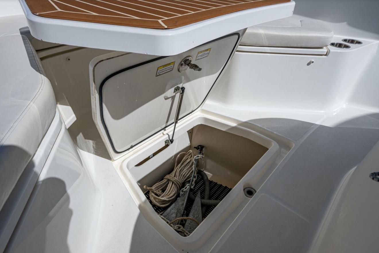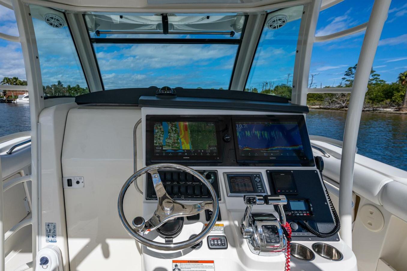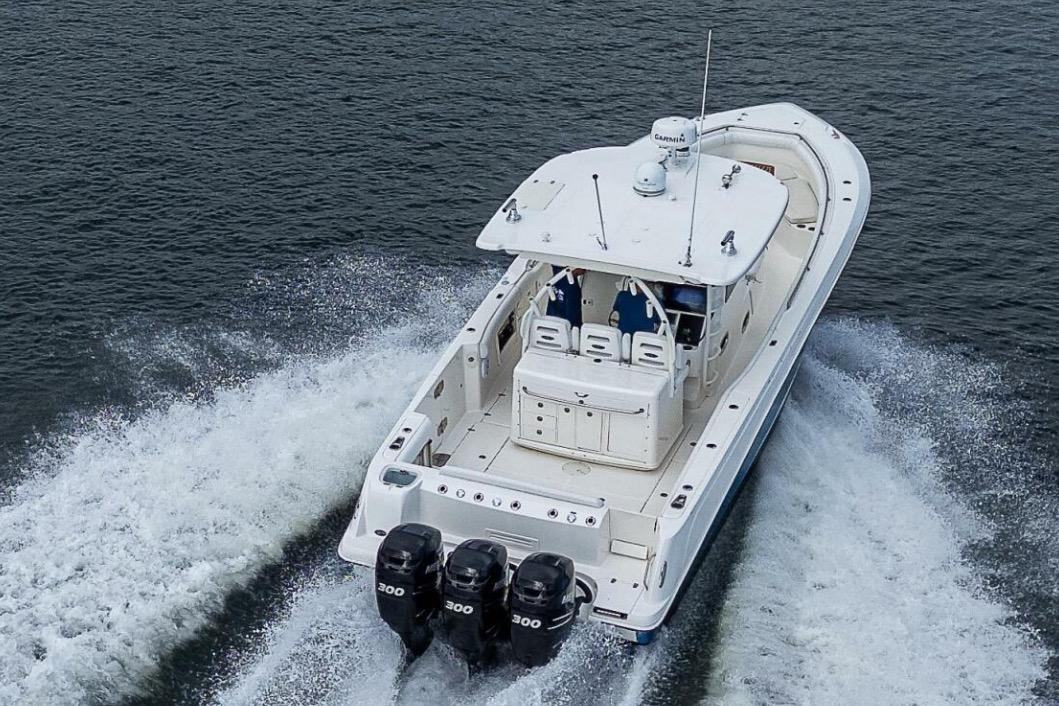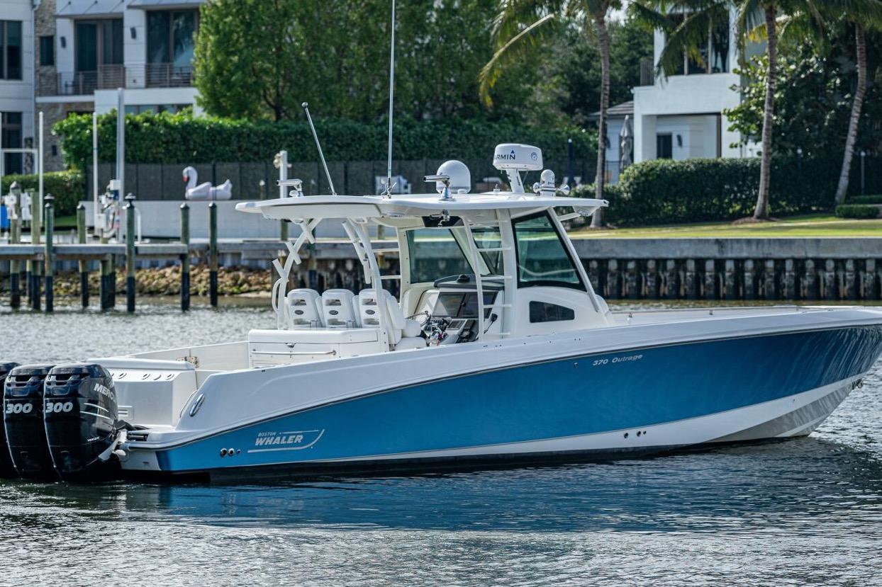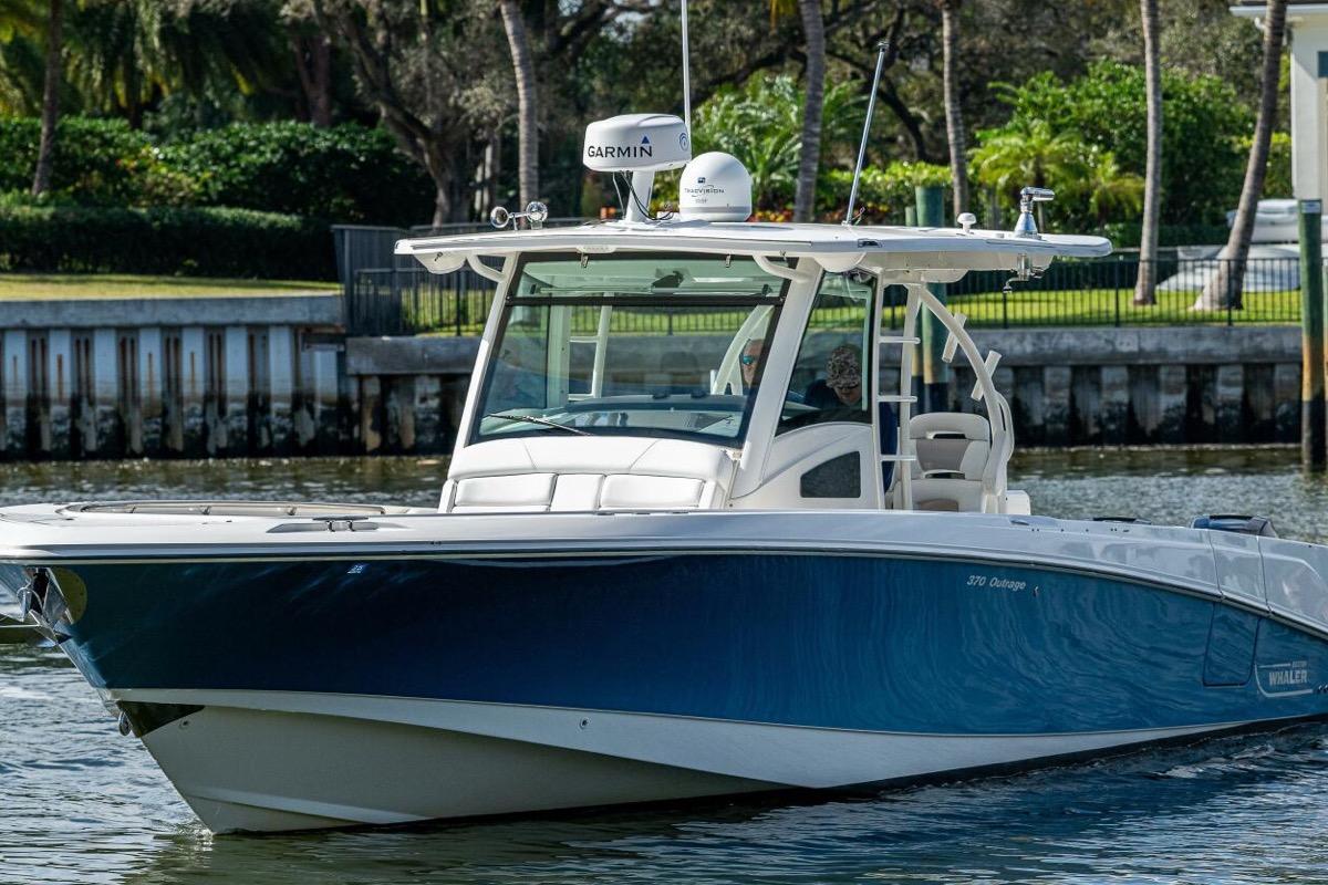 The 370 Outrage provides ample room for fighting fish or entertaining guests. The standard leaning post is well equipped for all of your boating activities with a large livewell, tackle storage, refrigerator/freezer, freshwater sink and grill. An optional Summer Kitchen leaning post provides even more entertaining options by replacing the livewell with an additional refrigerator and electric stove top. The ergonomically-correct center helm layout provides easy access to controls and includes a fold down helm standing platform and electrically adjustable captain's seat for maximum comfort and the integrated hardtop/windshield system that provides improved visibility and weather protection. The comfortable console forward lounge lifts to reveal lockable storage for rods, dive gear and carry on items. Down below, the well appointed cabin features a true two person berth/settee and other amenities that make it unique in its class.