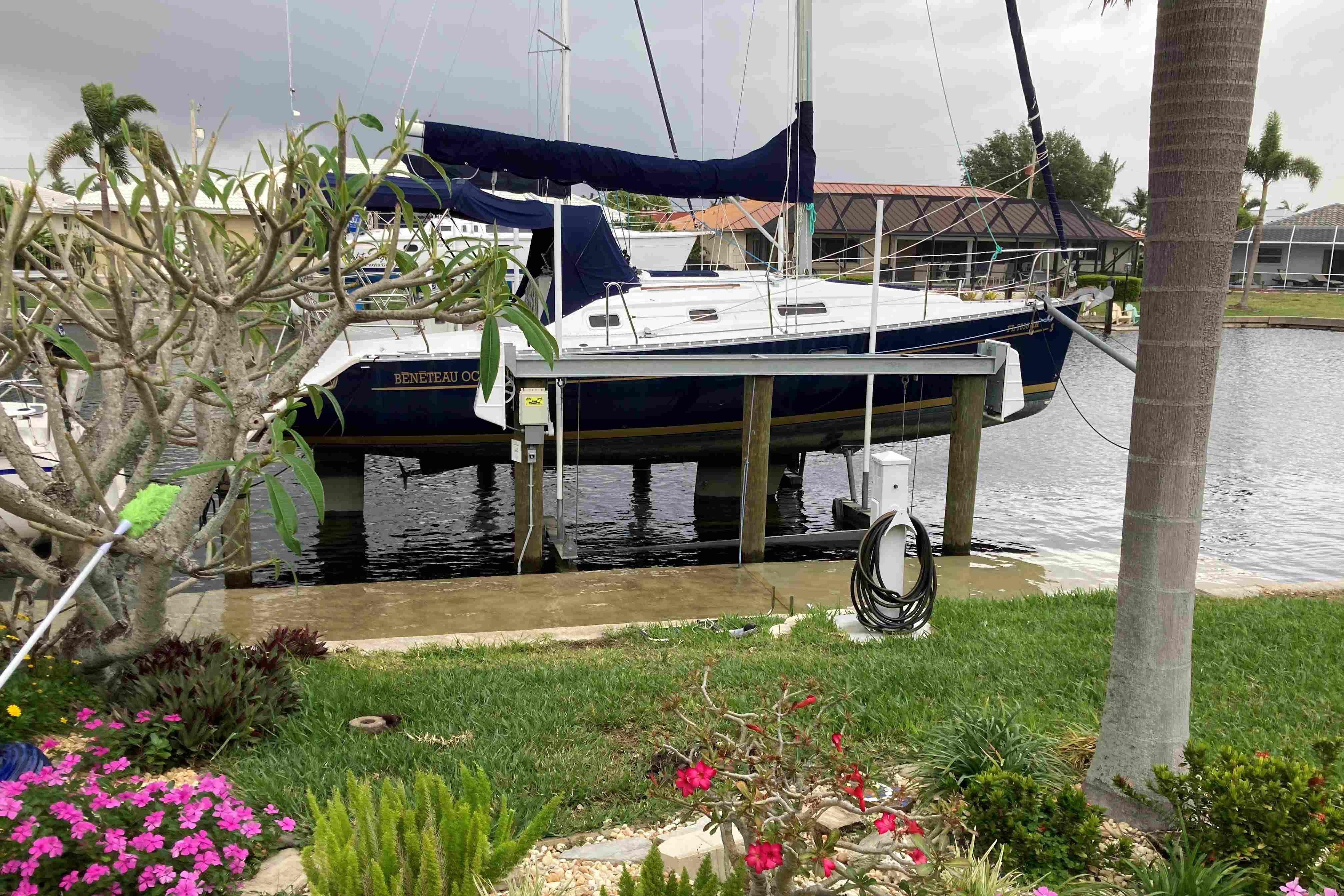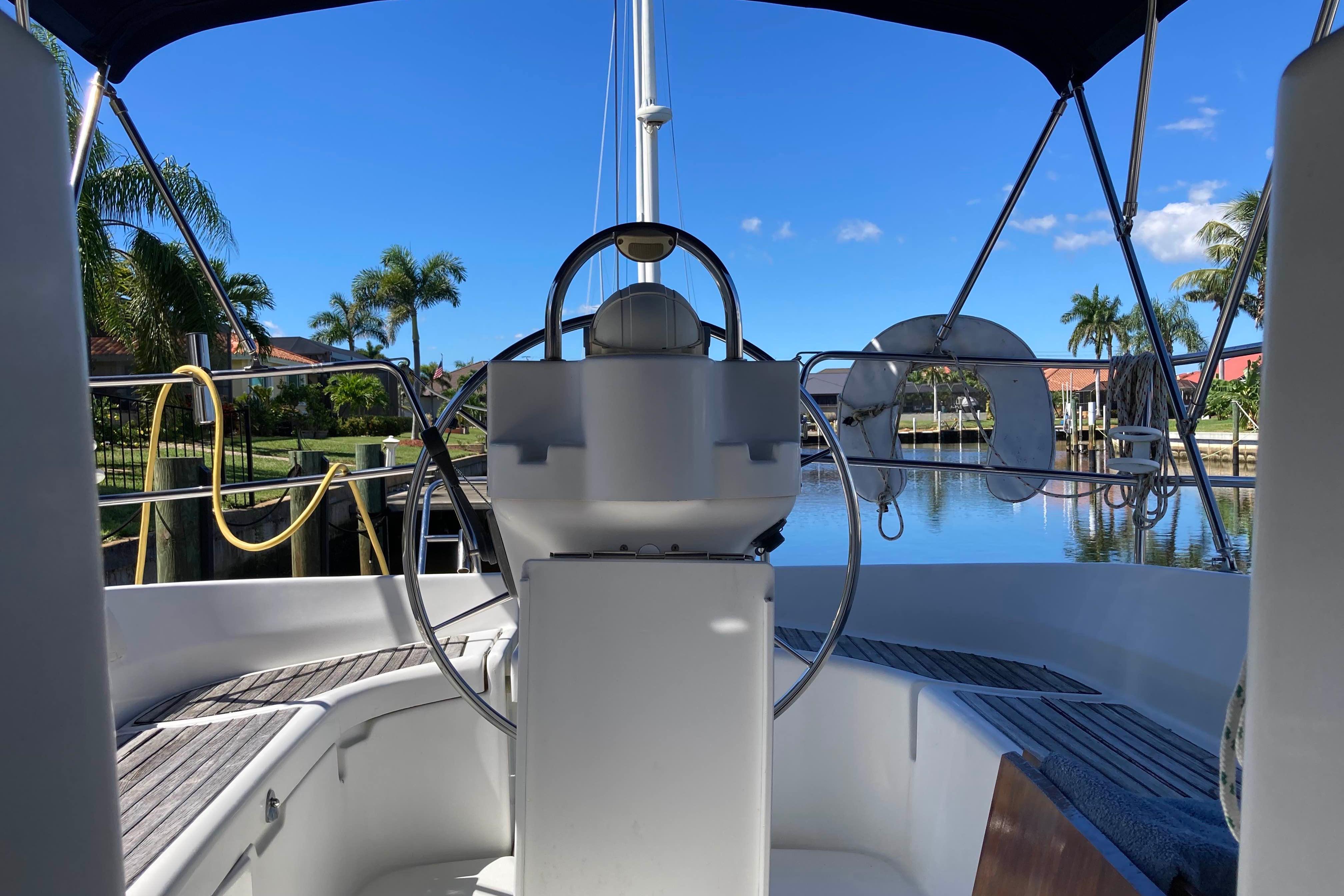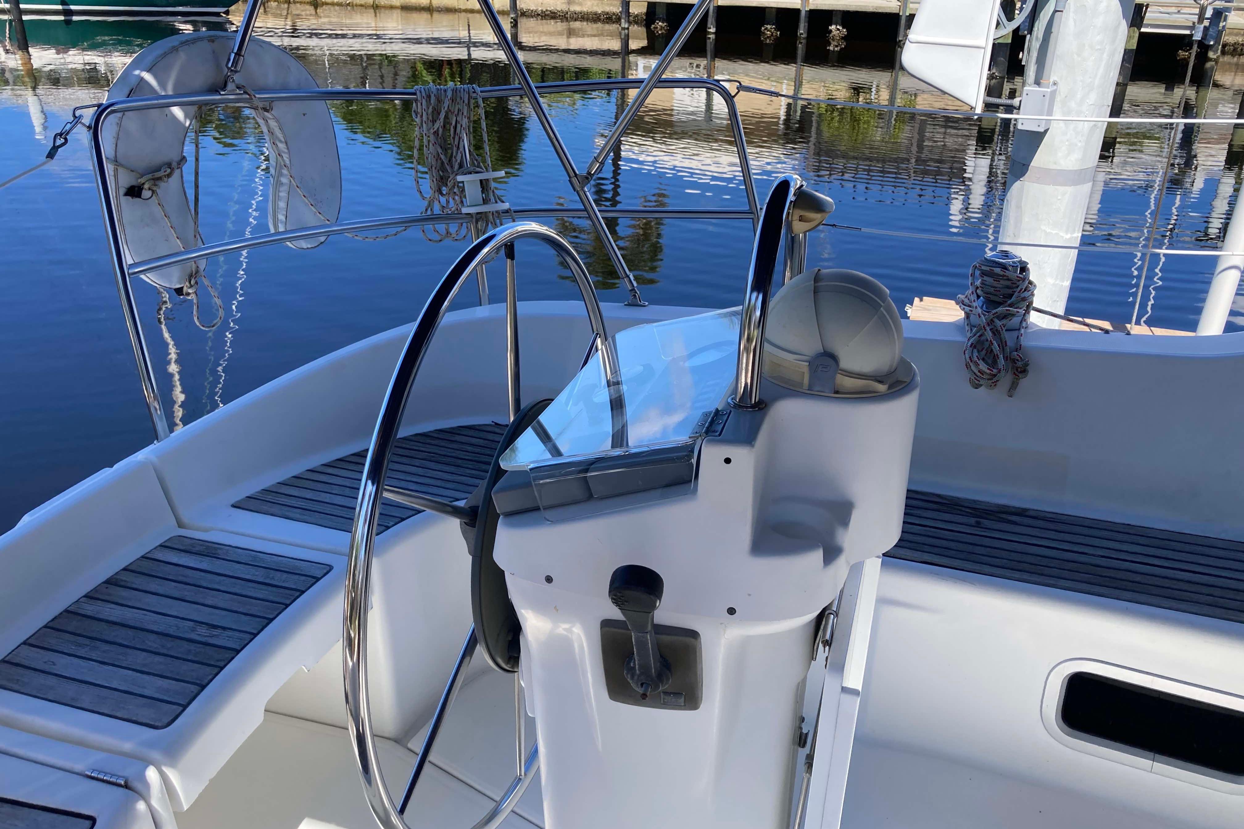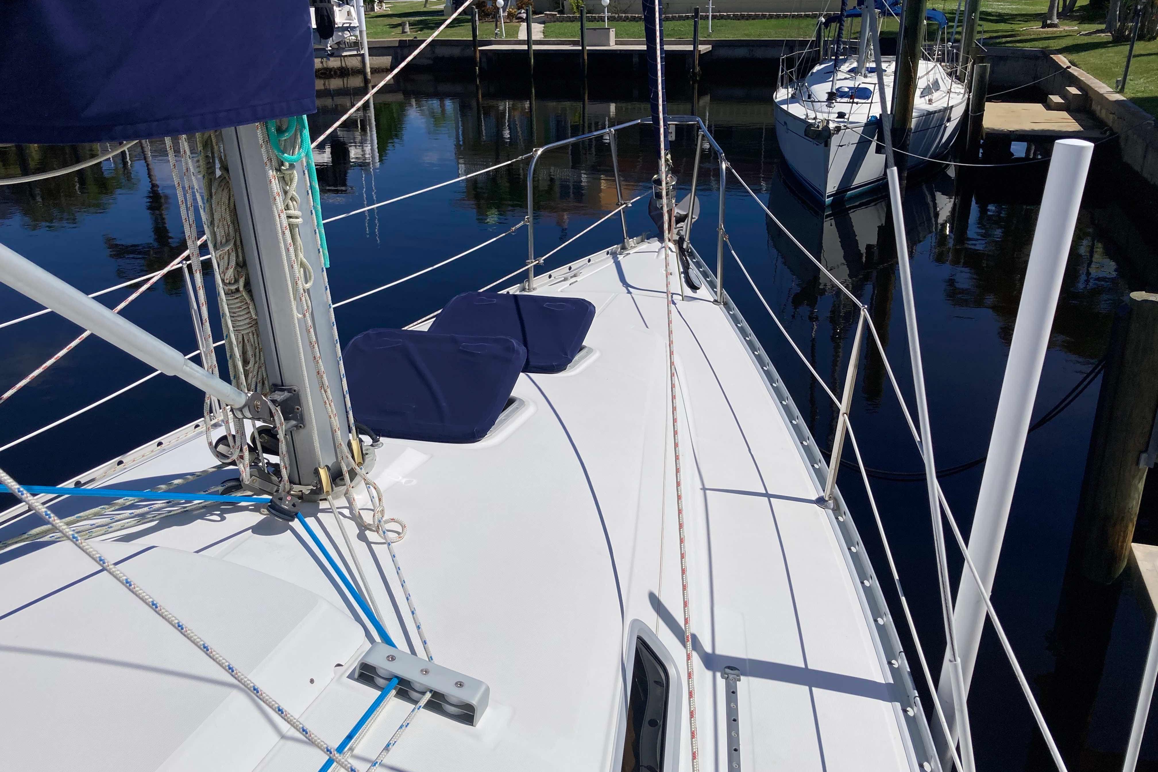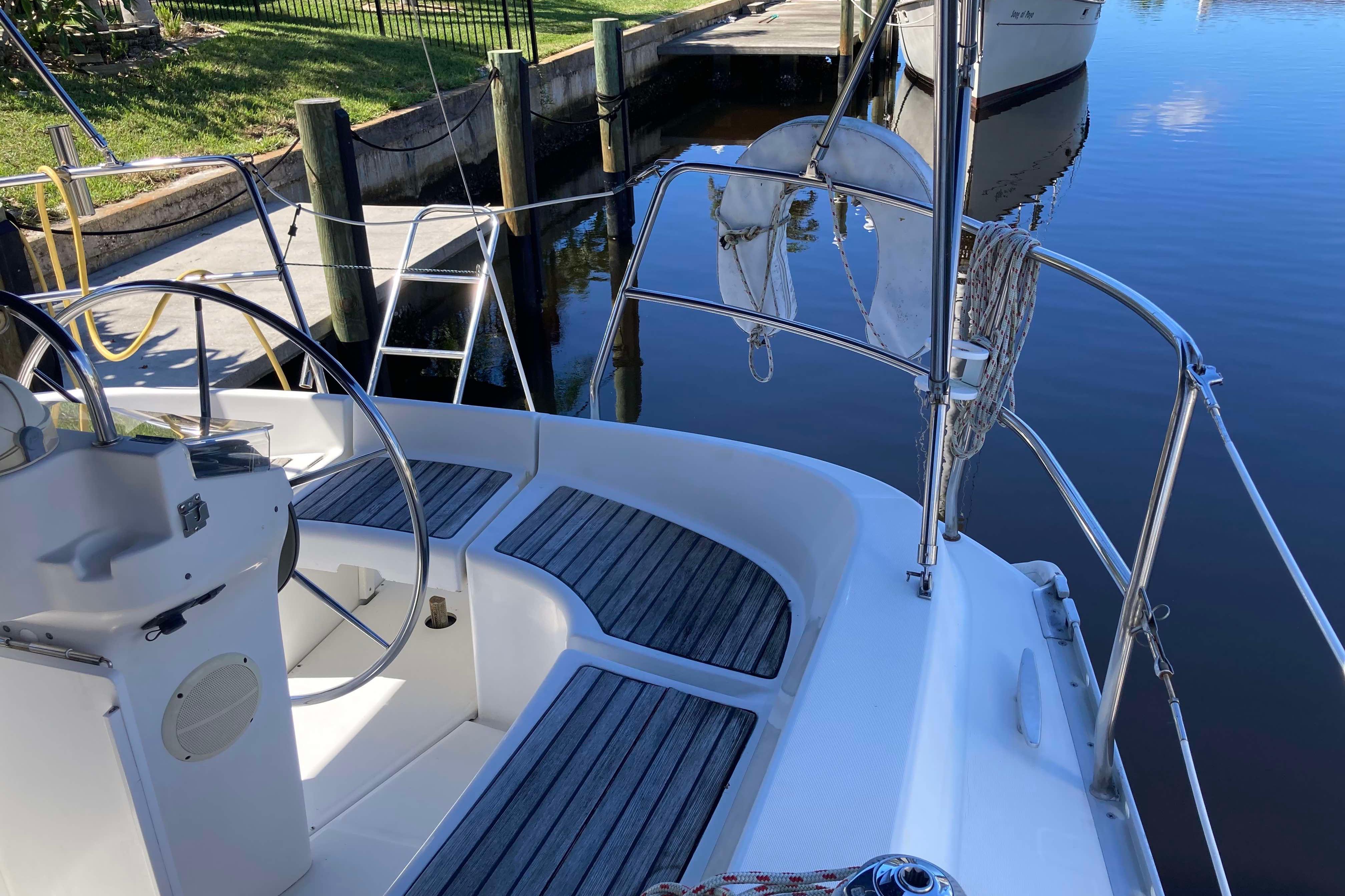 Designed by Groupe Finot, this Beneteau 311 is fast and comfortable with many characteristics that one might expect in much larger boats. The sugar scoop transom and the 4'8" shoal draft are perfect for Florida's West Coast, the Florida Keys and Bahamas. The dark blue Awlgripped exterior has gold trim and almost no wood for low maintenance. Her hull and integral molded grid system is designed to create an extremely strong and stiff structure. The bulb keel, despite its moderate draft, ensures excellent performance under sail. Her large sail area is divided between the mainsail with battens and the moderate overlap furling genoa. The large cockpit is uncluttered and the genoa sheet winches are within easy reach of the helm.