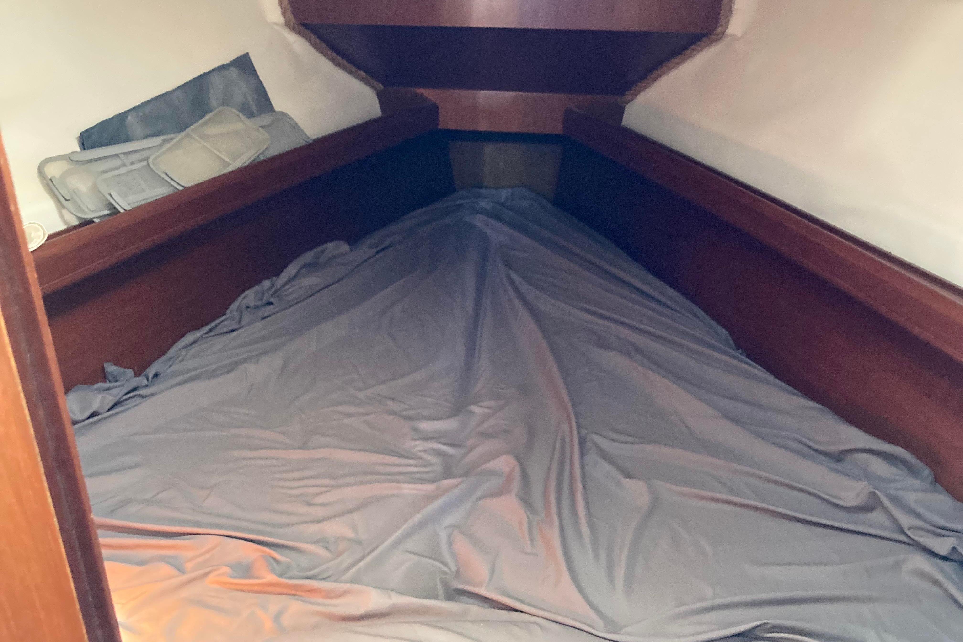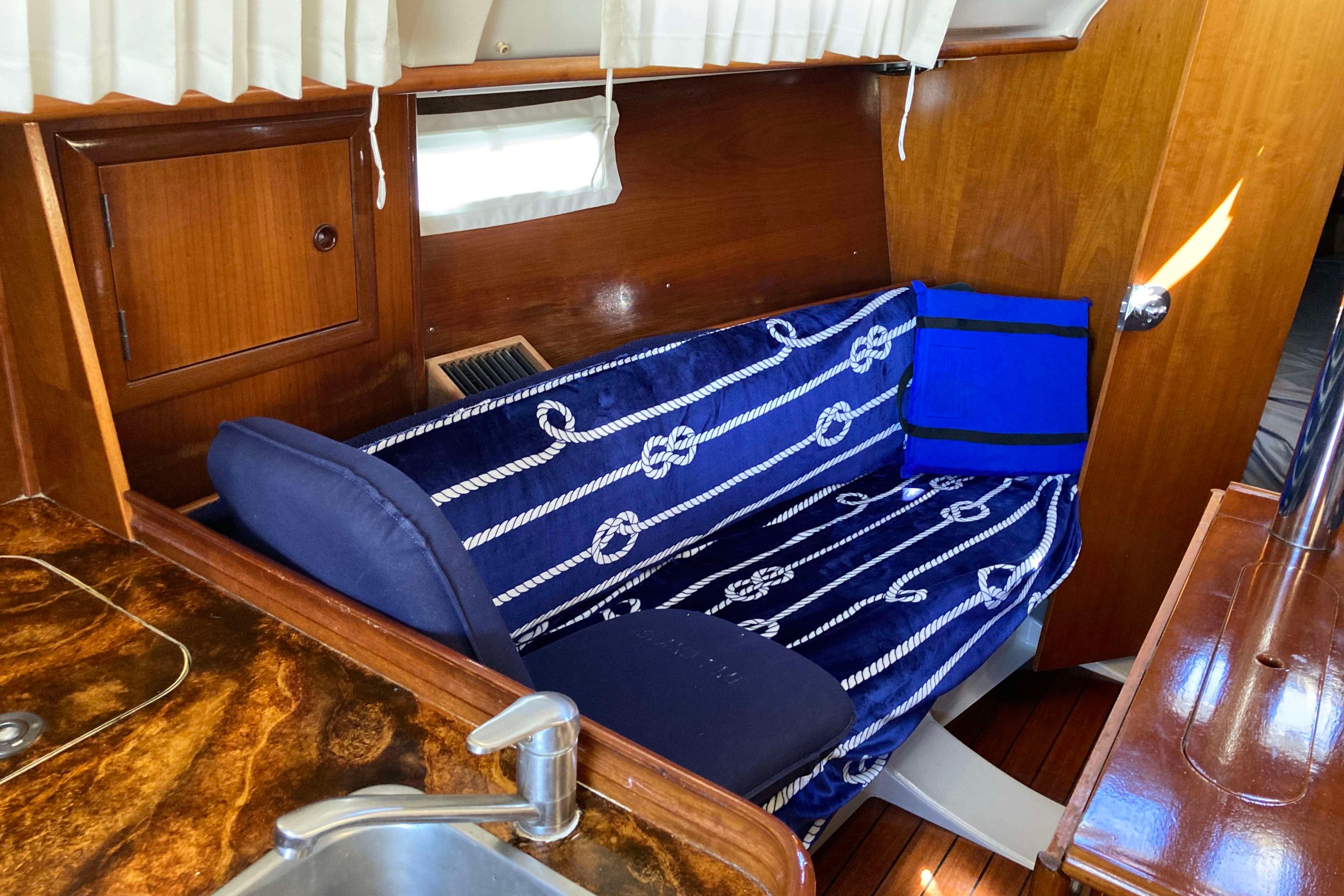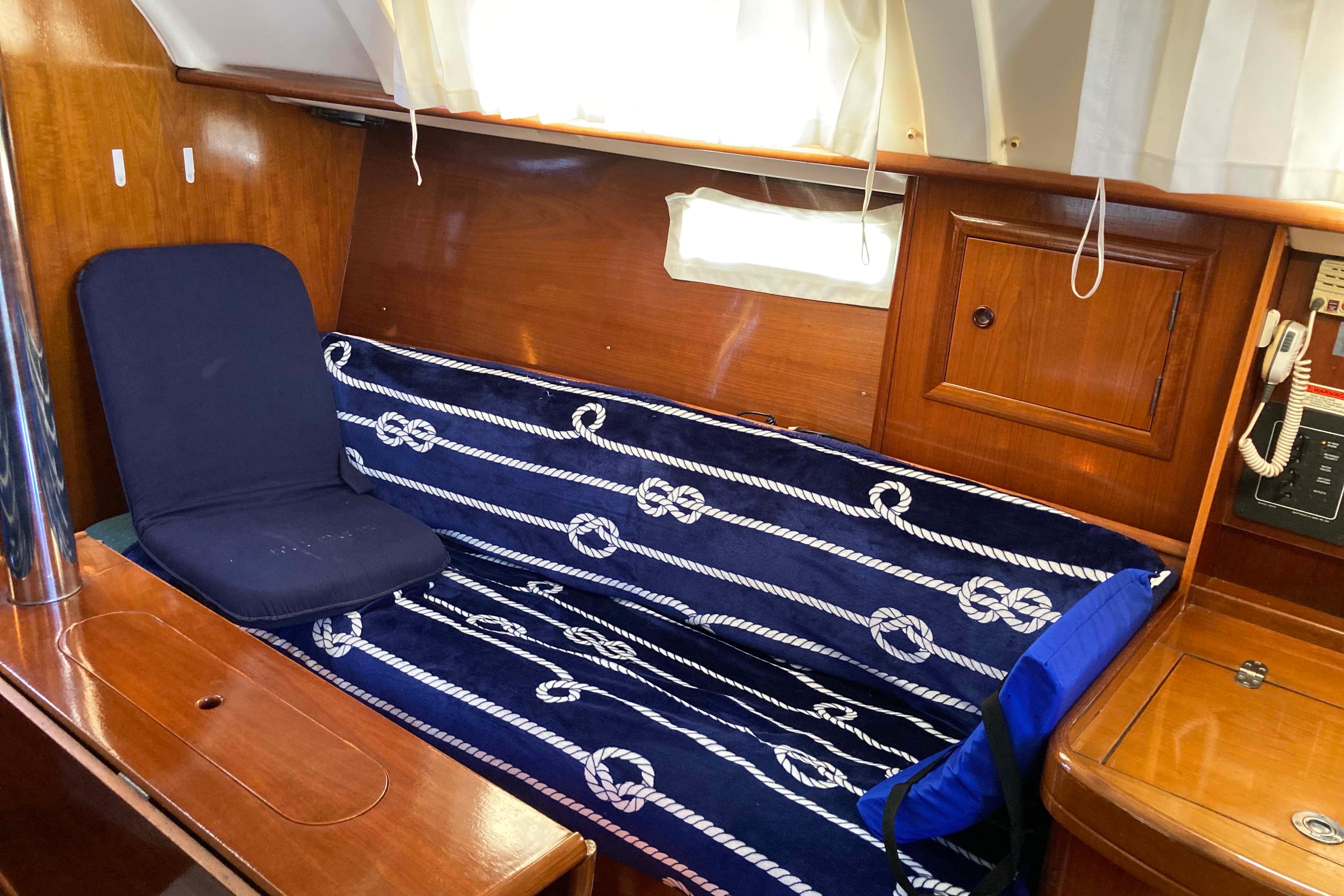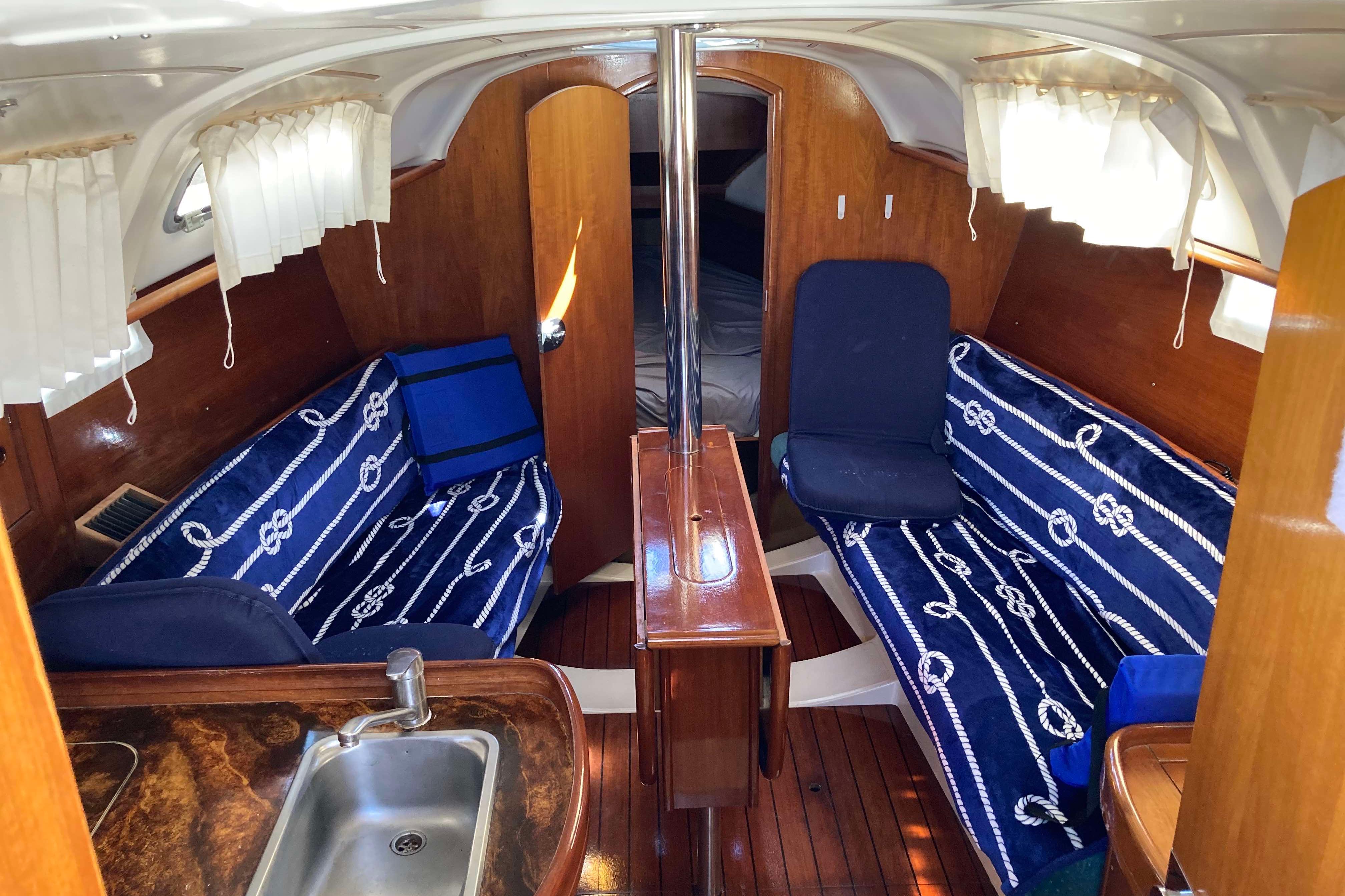 Below deck and to port is the galley with gimbaled stove, stainless steel sink with pressurized hot and cold water, ice box with refrigeration and plenty of storage. To port there is a large head with a marine toilet and wash basin including a shower with pressurized hot and cold water. A hanging locker with plenty of room to store sundries is also to port. To starboard is a large navigation table. Electronics can be easily seen from the bulkhead. Forward the salon consists of two settees flanking a large drop-leaf table. The 311 has two cabins - forward and aft. The private forward cabin has a large V-berth, a hanging locker, and lots of storage along the side of the hull. The aft cabin is also generous in size with plenty of room for storage.