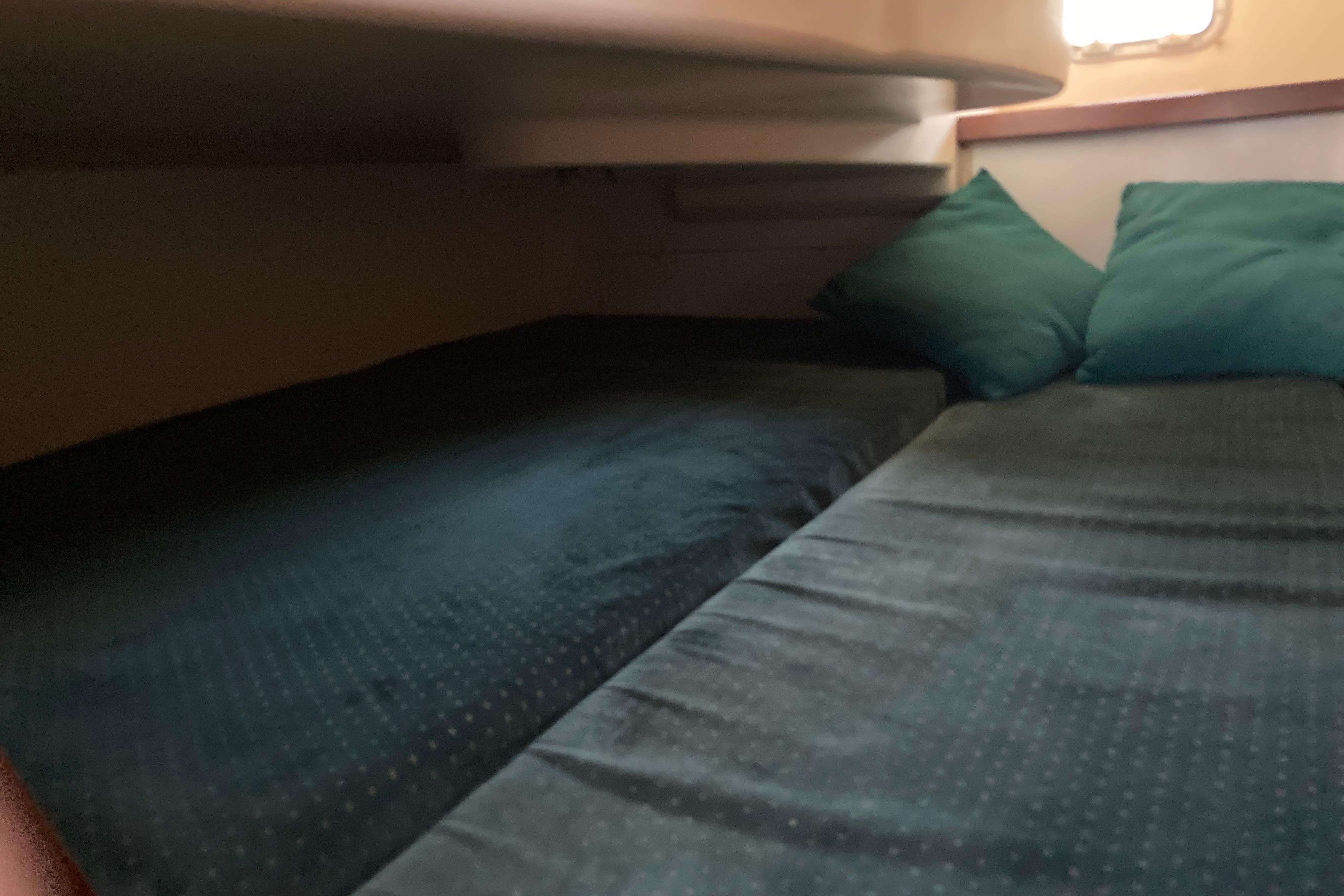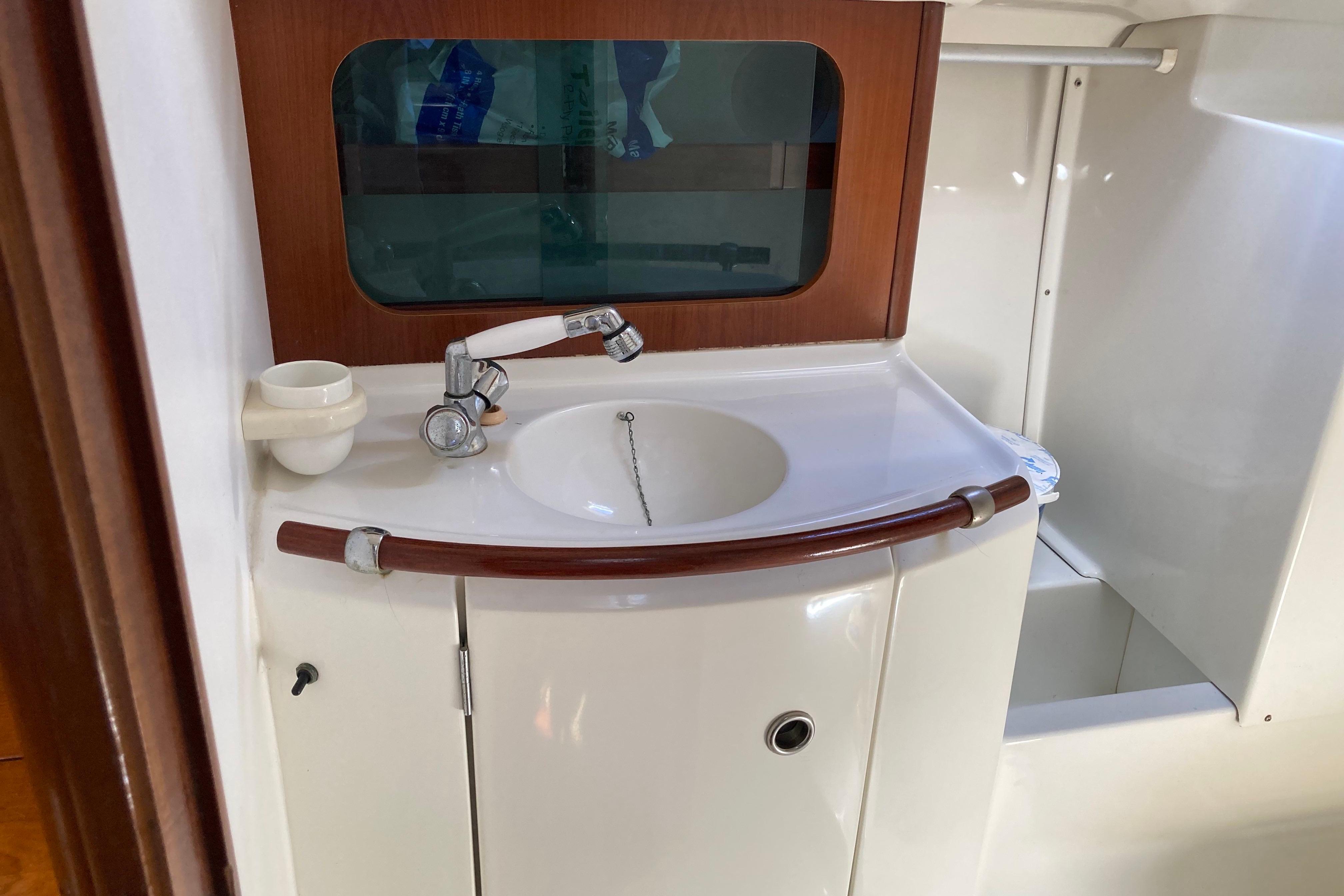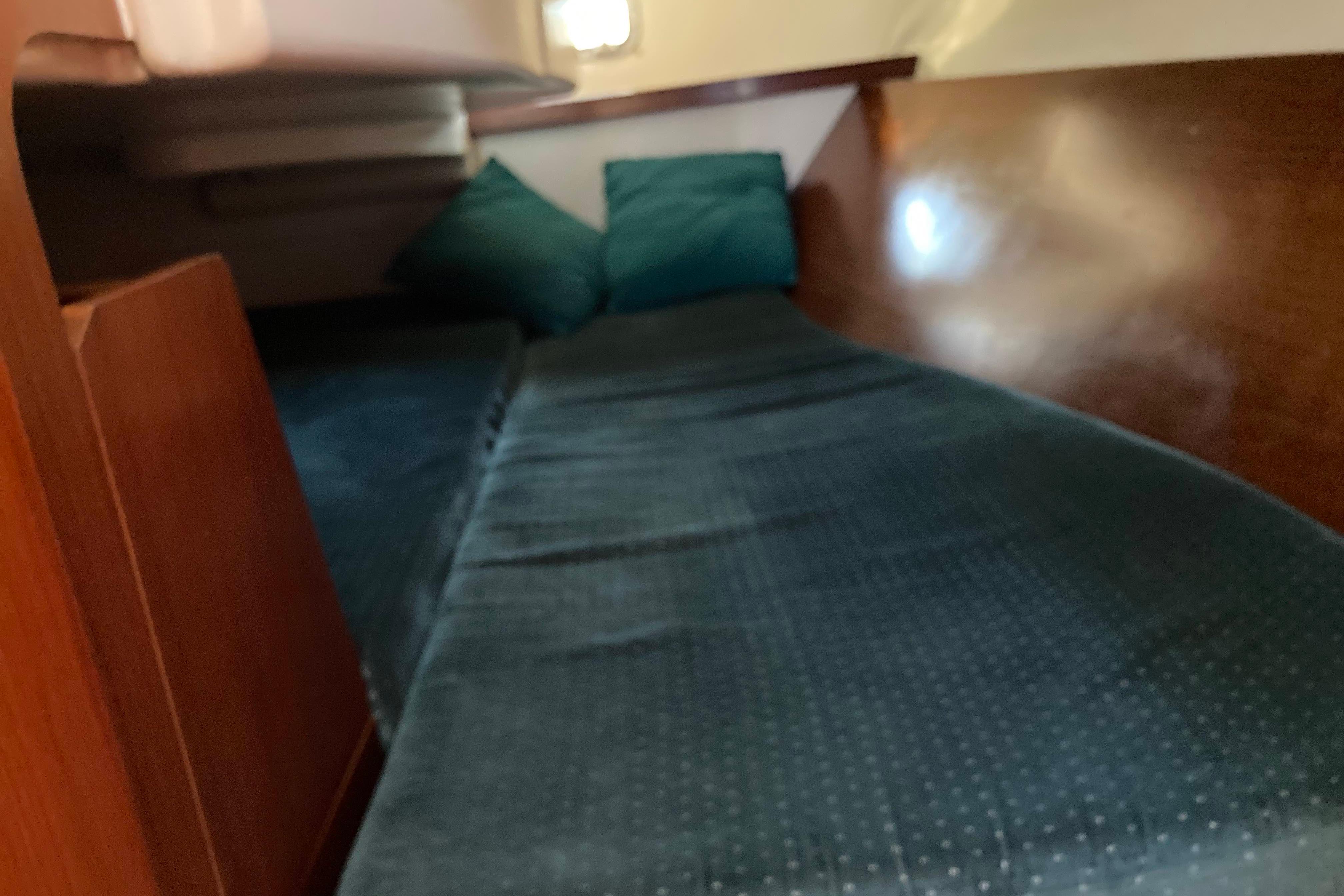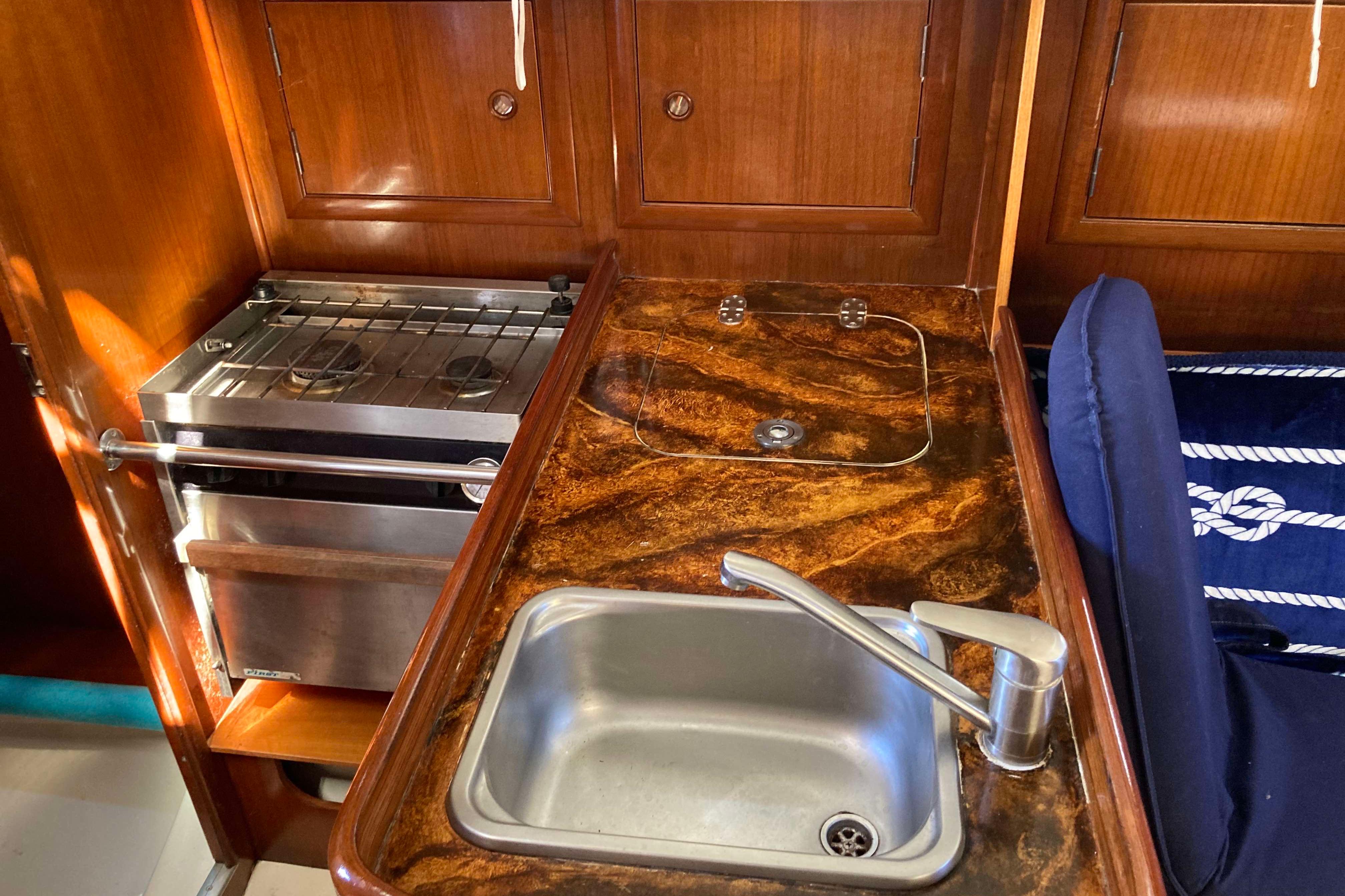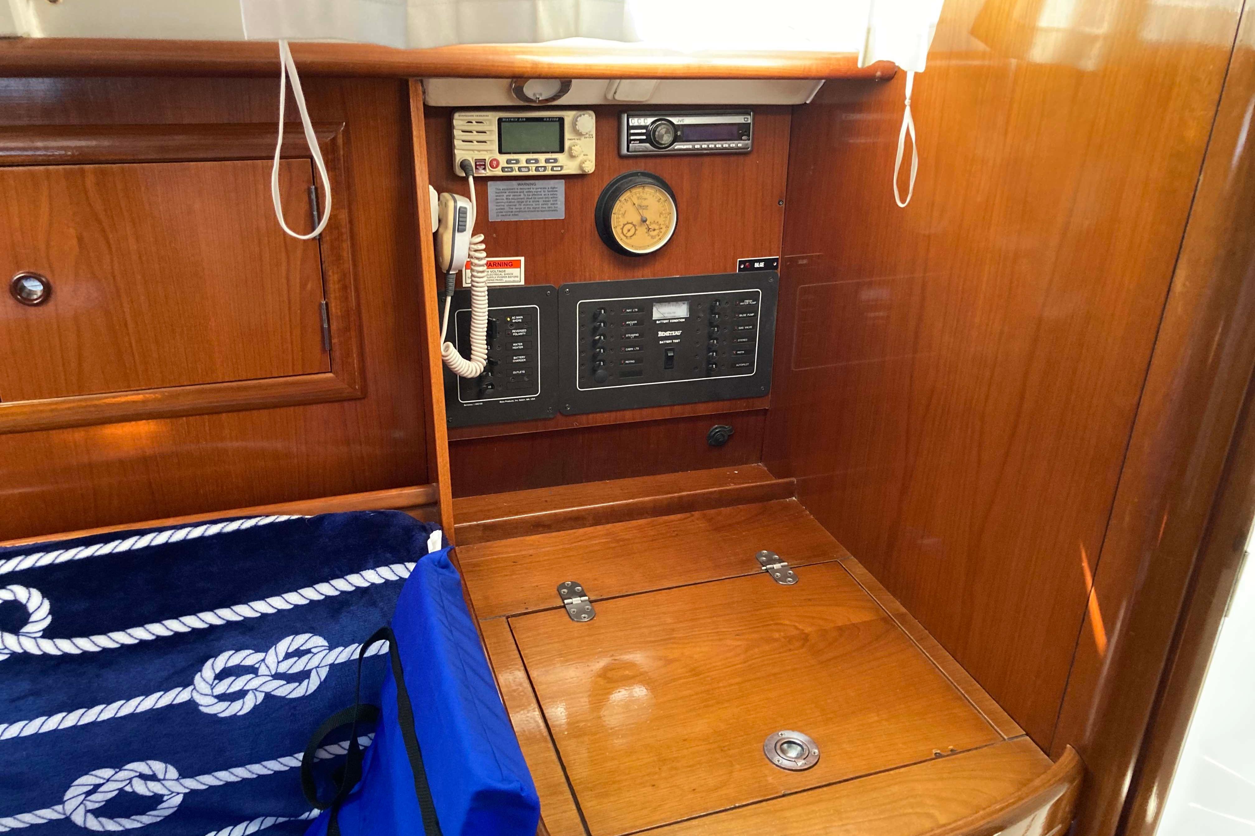 Below deck and to port is the galley with gimbaled stove, stainless steel sink with pressurized hot and cold water, ice box with refrigeration and plenty of storage. To port there is a large head with a marine toilet and wash basin including a shower with pressurized hot and cold water. A hanging locker with plenty of room to store sundries is also to port. To starboard is a large navigation table. Electronics can be easily seen from the bulkhead. Forward the salon consists of two settees flanking a large drop-leaf table. The 311 has two cabins - forward and aft. The private forward cabin has a large V-berth, a hanging locker, and lots of storage along the side of the hull. The aft cabin is also generous in size with plenty of room for storage.