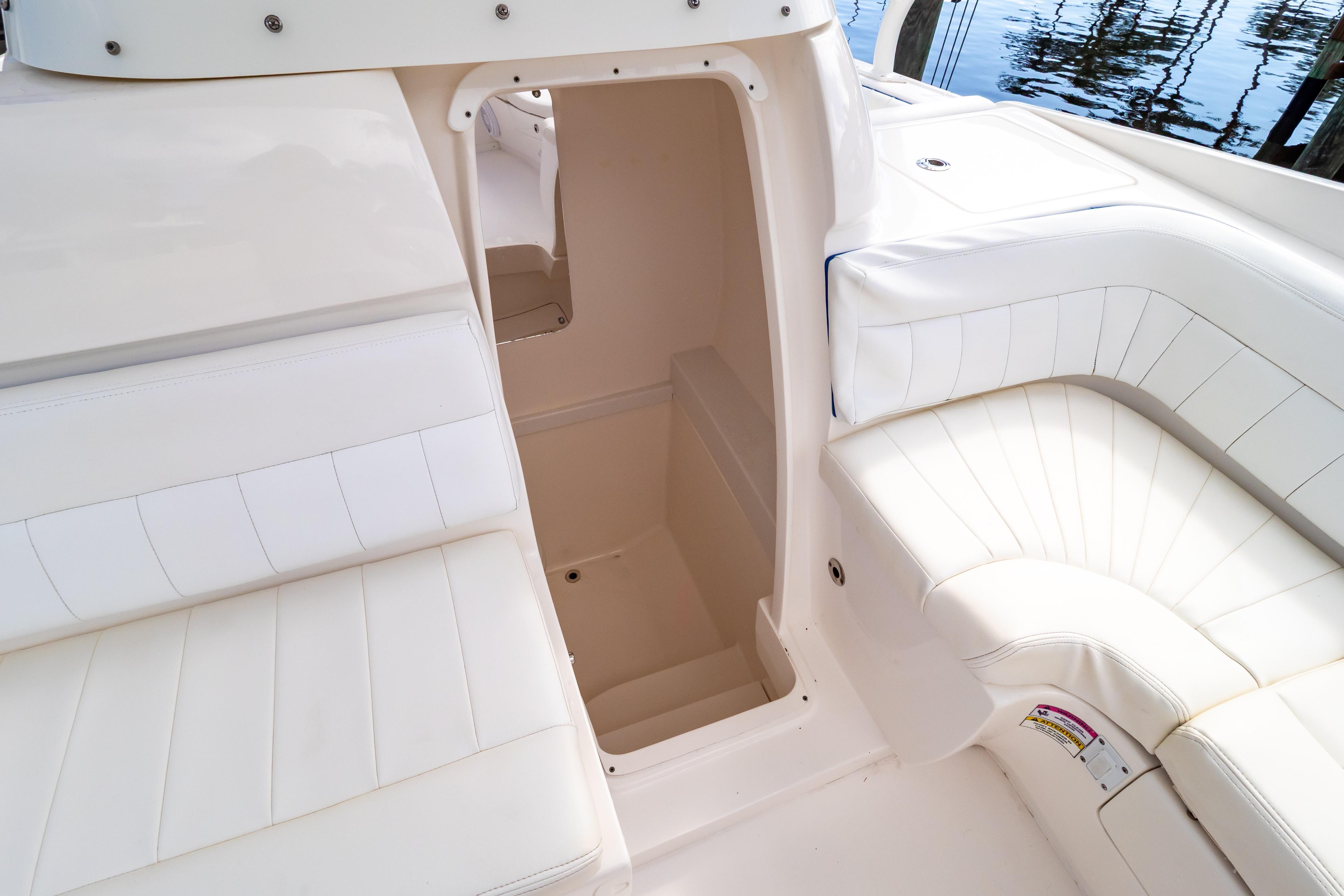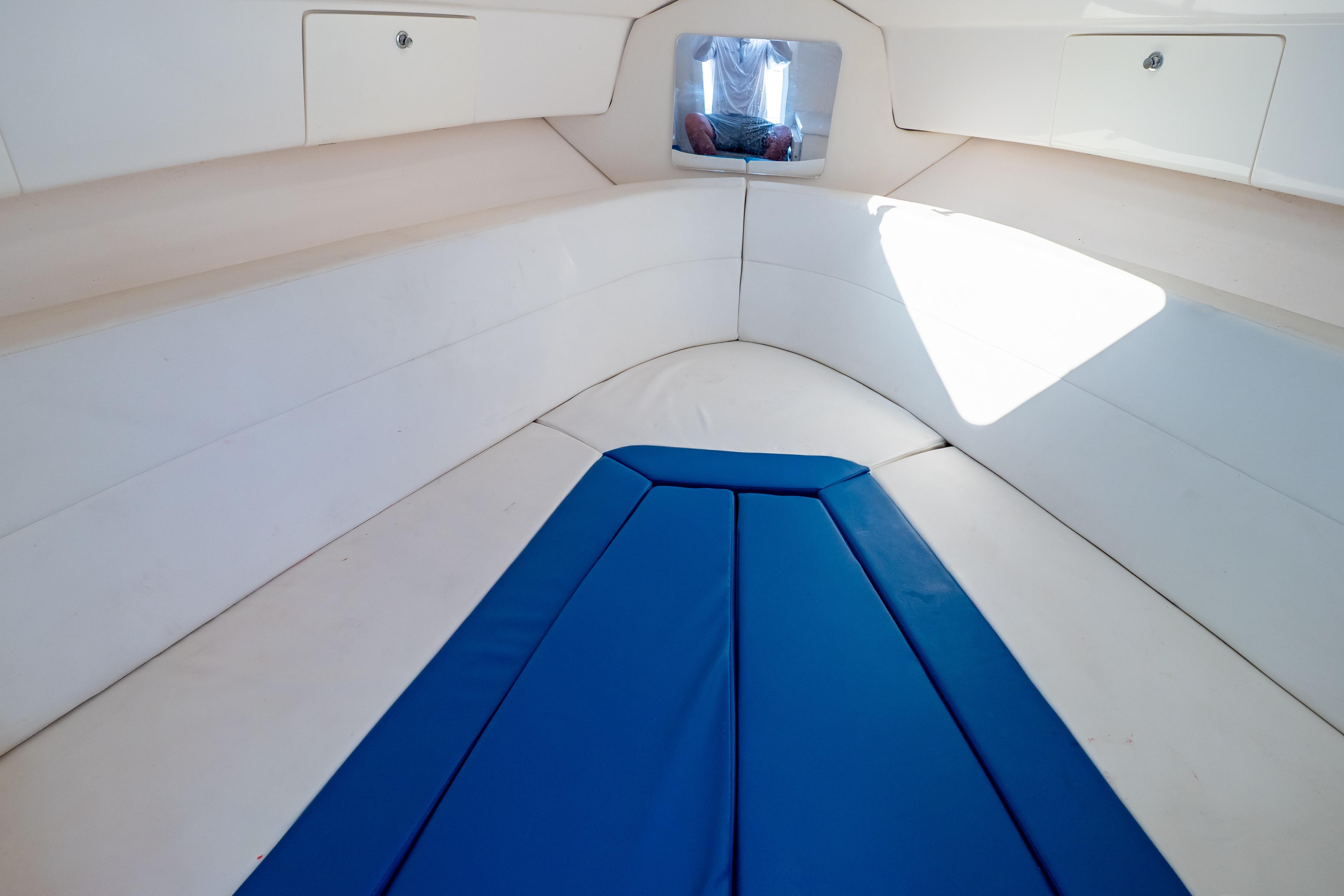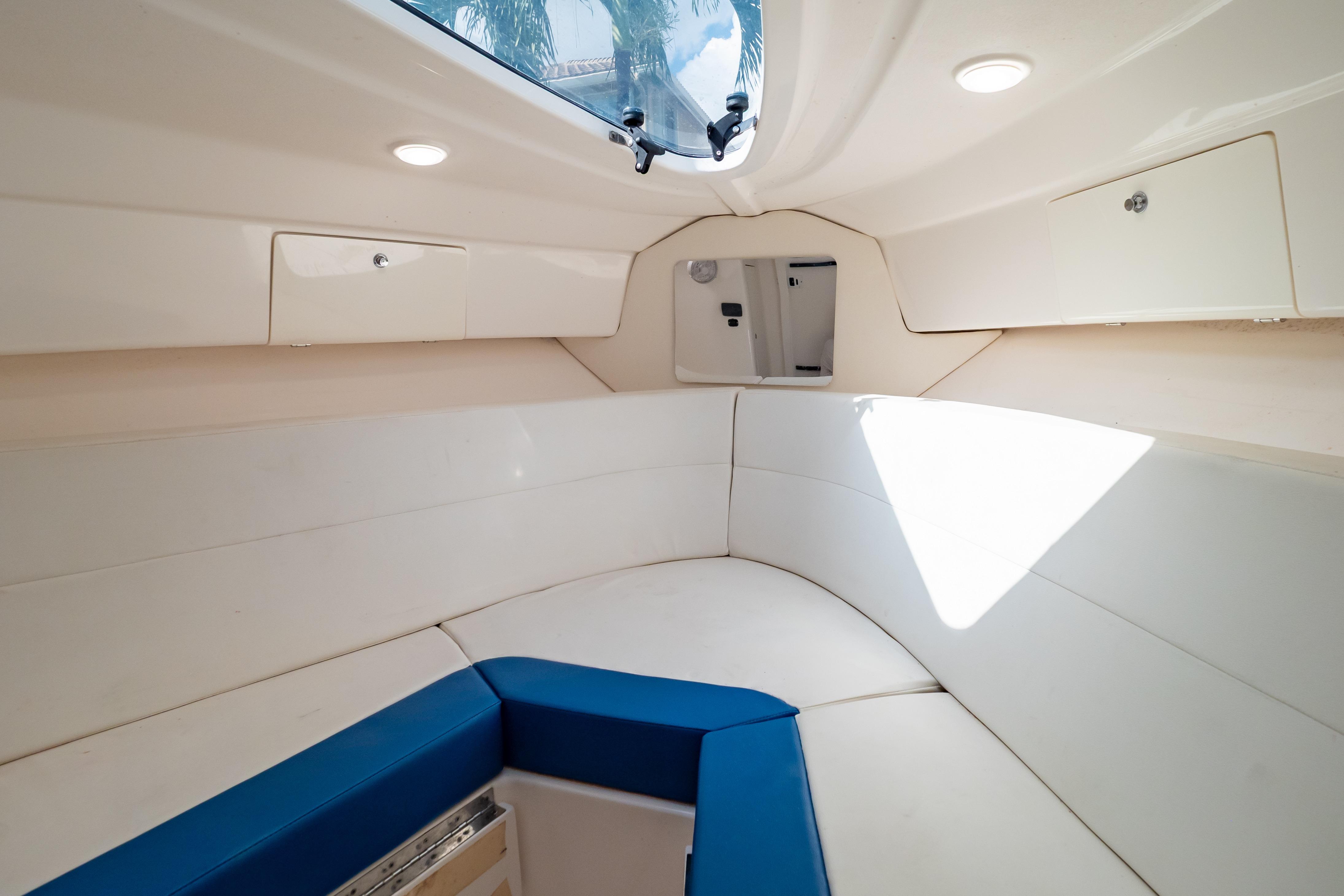 Building on the breakthrough hull platform recently introduced on our revolutionary 327 Center Console, this cuddy tops it off with an array of innovative design features that includes luxurious new seating arrangements and an ingeniously redesigned interior. The dual vented aft keel, elevated freeboard, wider chines and increased running surface are designed to support a heavier twin power package while maintaining fuel efficiency. The sleek, head-turning sheer line mirrors the contemporary hull design. The spacious new cabin design includes customer friendly innovations, like integrated overhead storage units on both the port and starboard sides that stow gear and eliminate clutter, additional cabinetry and space for endless customizations, like an optional refrigerator. The forward v-berth features new fold-away settee cushions that convert it from a roomy wraparound lounge to luxurious overnight accommodations.