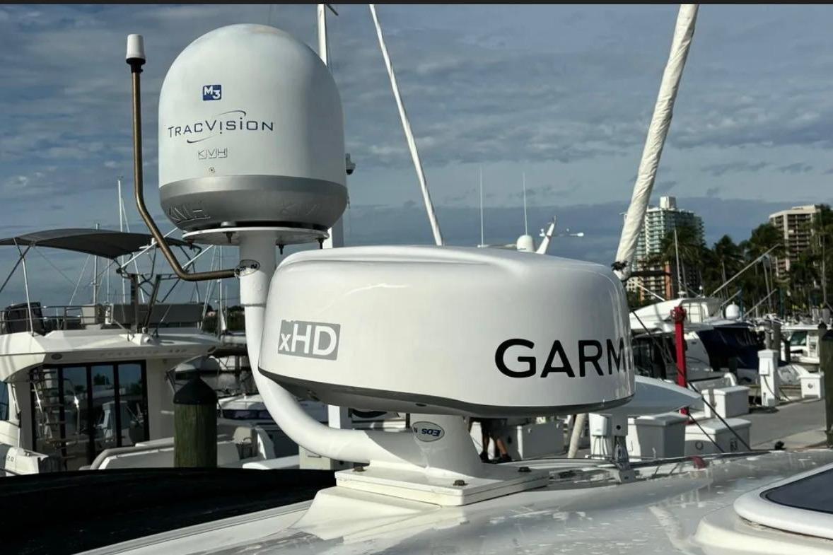 Electronics include Garmin GPSMAP 7212 with radar and Garmin VHF 100. 30A dual shore power inputs plus a Kohler 7kW generator for full off-grid capability.