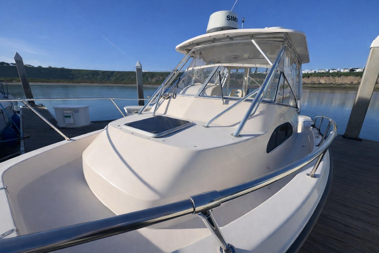 The cabin offers overnight accommodations for extended fishing trips or weekend cruising, while the spacious cockpit layout is built for serious anglers: huge fish boxes, livewell, wide walkarounds, and plenty of storage. Helm visibility is excellent, and the electronics package makes navigating coastal waters effortless. A bow thruster adds extra maneuverability—ideal for tight docking situations and the Newport Harbor environment.