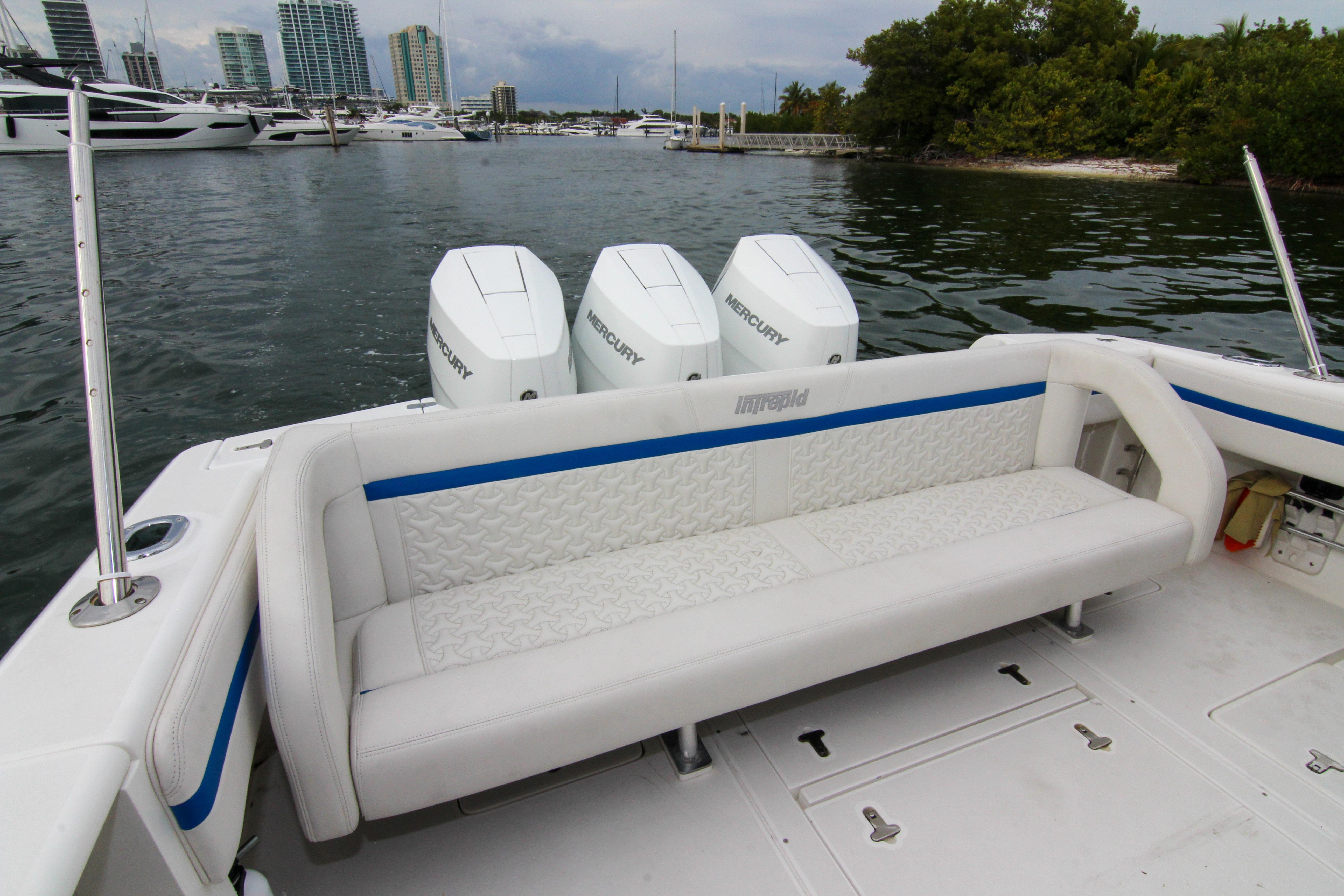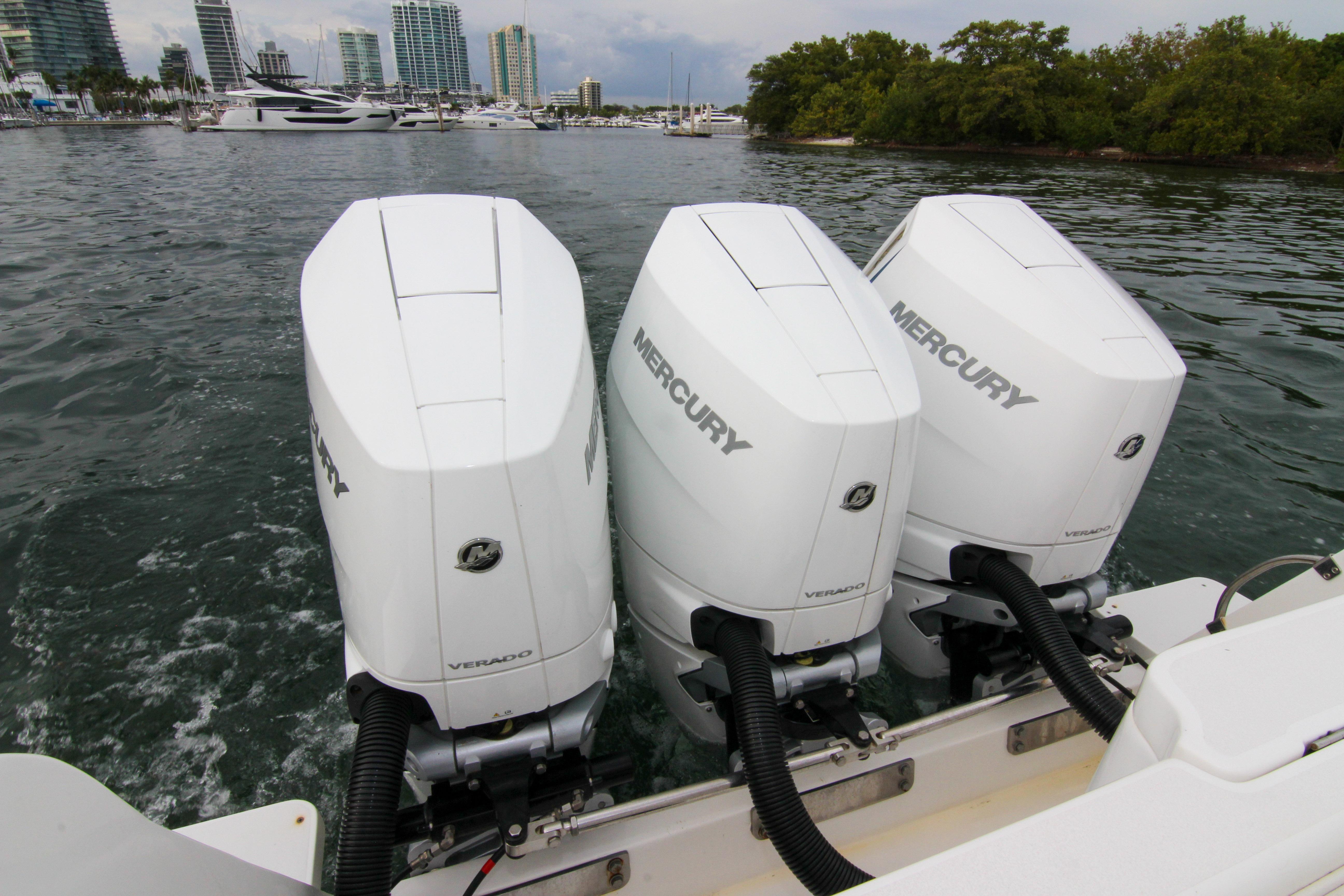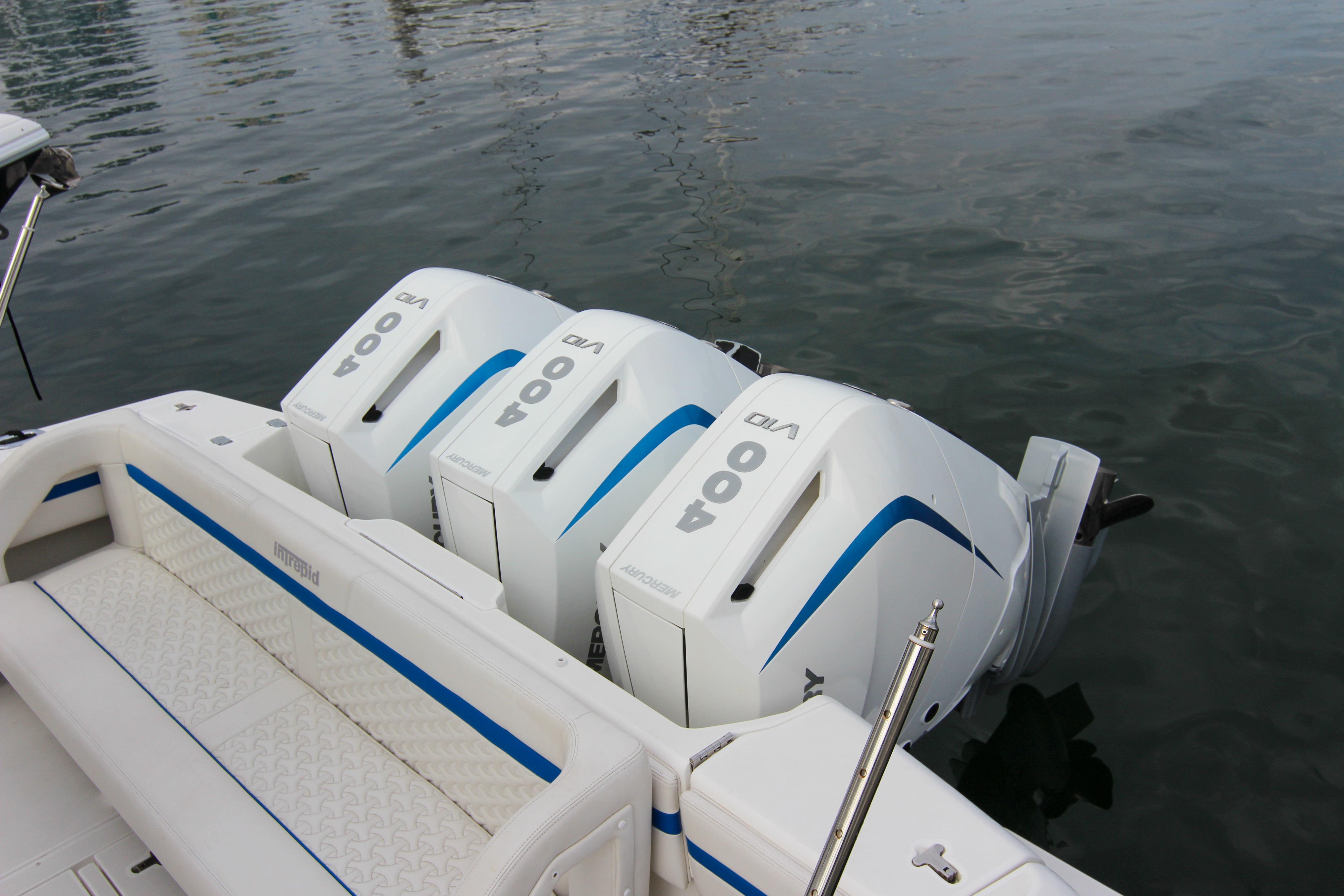 What truly elevates this particular 2003 Intrepid 377 Walkaround above its peers is its remarkable repower and suite of modern upgrades. Originally designed for triple outboard configurations, this vessel has been outfitted with a trio of cutting-edge Mercury 400 V10 outboards, delivering a staggering 1,200 horsepower in total. These engines represent the pinnacle of Mercury's Verado lineup, featuring advanced supercharged V10 architecture that combines raw power with refined operation. With just 220 hours on the clocks, these motors are practically new, having barely scratched the surface of their potential lifespan. Better yet, they come backed by a factory warranty, providing peace of mind for the discerning owner who demands reliability on every outing. Whether you're throttling up for a high-speed run to the Bahamas or idling through no-wake zones, the triple 400s offer effortless acceleration, impressive fuel efficiency for their class, and a top speed that can push well beyond 60 knots under optimal conditions. The low hours mean minimal wear, and the warranty covers potential issues, making this setup a rare find in a boat of this vintage.