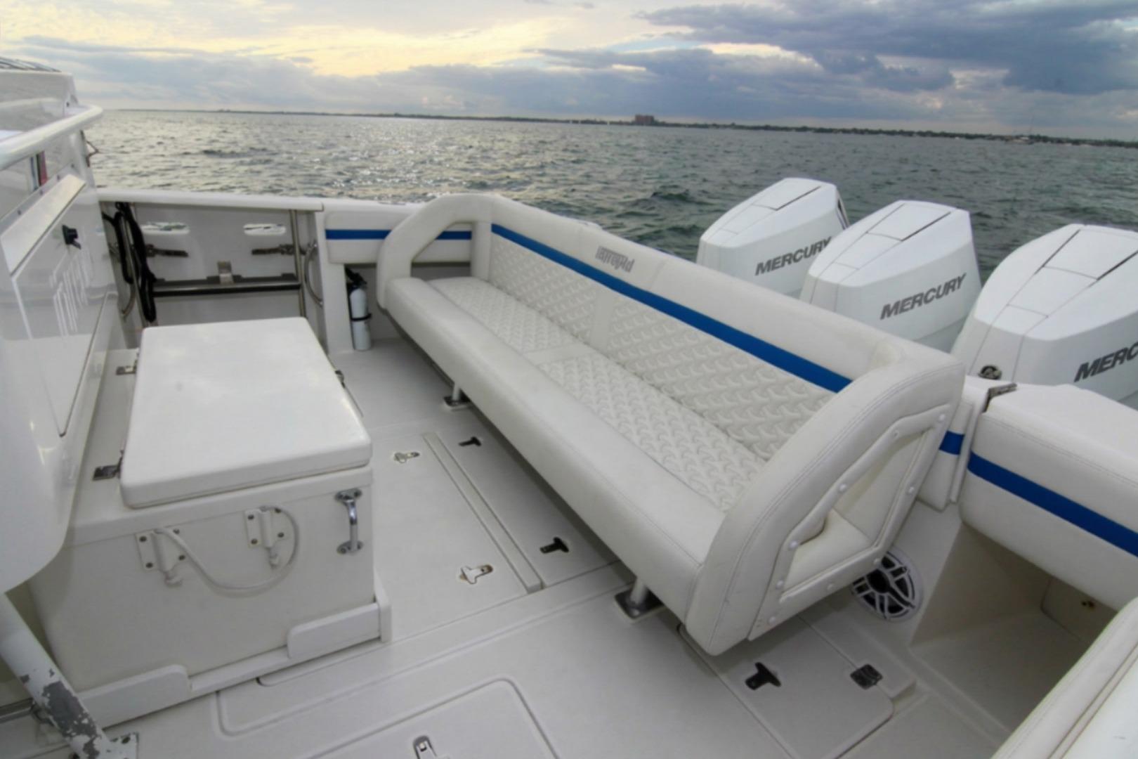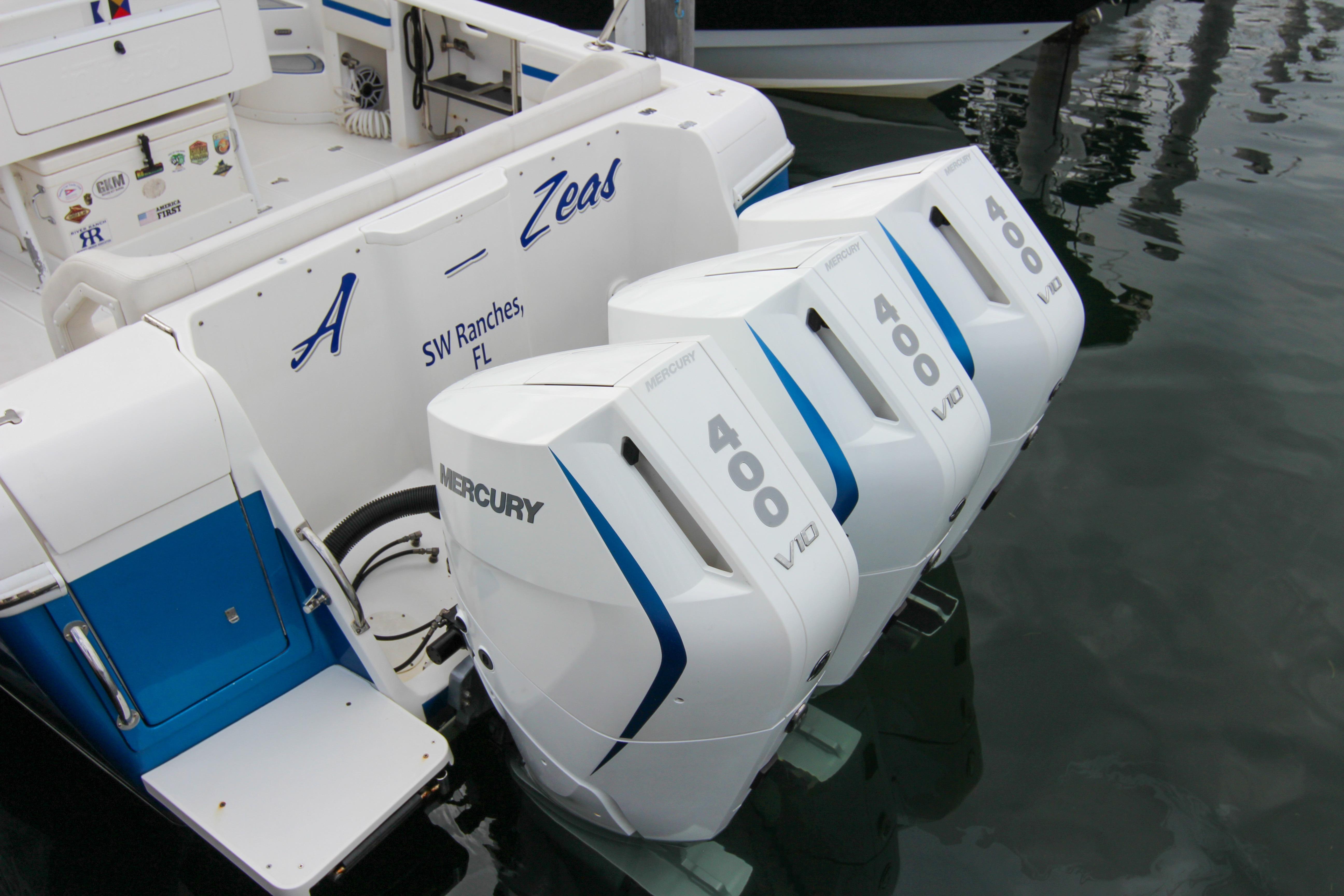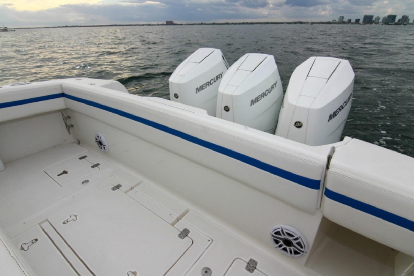 What truly elevates this particular 2003 Intrepid 377 Walkaround above its peers is its remarkable repower and suite of modern upgrades. Originally designed for triple outboard configurations, this vessel has been outfitted with a trio of cutting-edge Mercury 400 V10 outboards, delivering a staggering 1,200 horsepower in total. These engines represent the pinnacle of Mercury's Verado lineup, featuring advanced supercharged V10 architecture that combines raw power with refined operation. With just 220 hours on the clocks, these motors are practically new, having barely scratched the surface of their potential lifespan. Better yet, they come backed by a factory warranty, providing peace of mind for the discerning owner who demands reliability on every outing. Whether you're throttling up for a high-speed run to the Bahamas or idling through no-wake zones, the triple 400s offer effortless acceleration, impressive fuel efficiency for their class, and a top speed that can push well beyond 60 knots under optimal conditions. The low hours mean minimal wear, and the warranty covers potential issues, making this setup a rare find in a boat of this vintage.