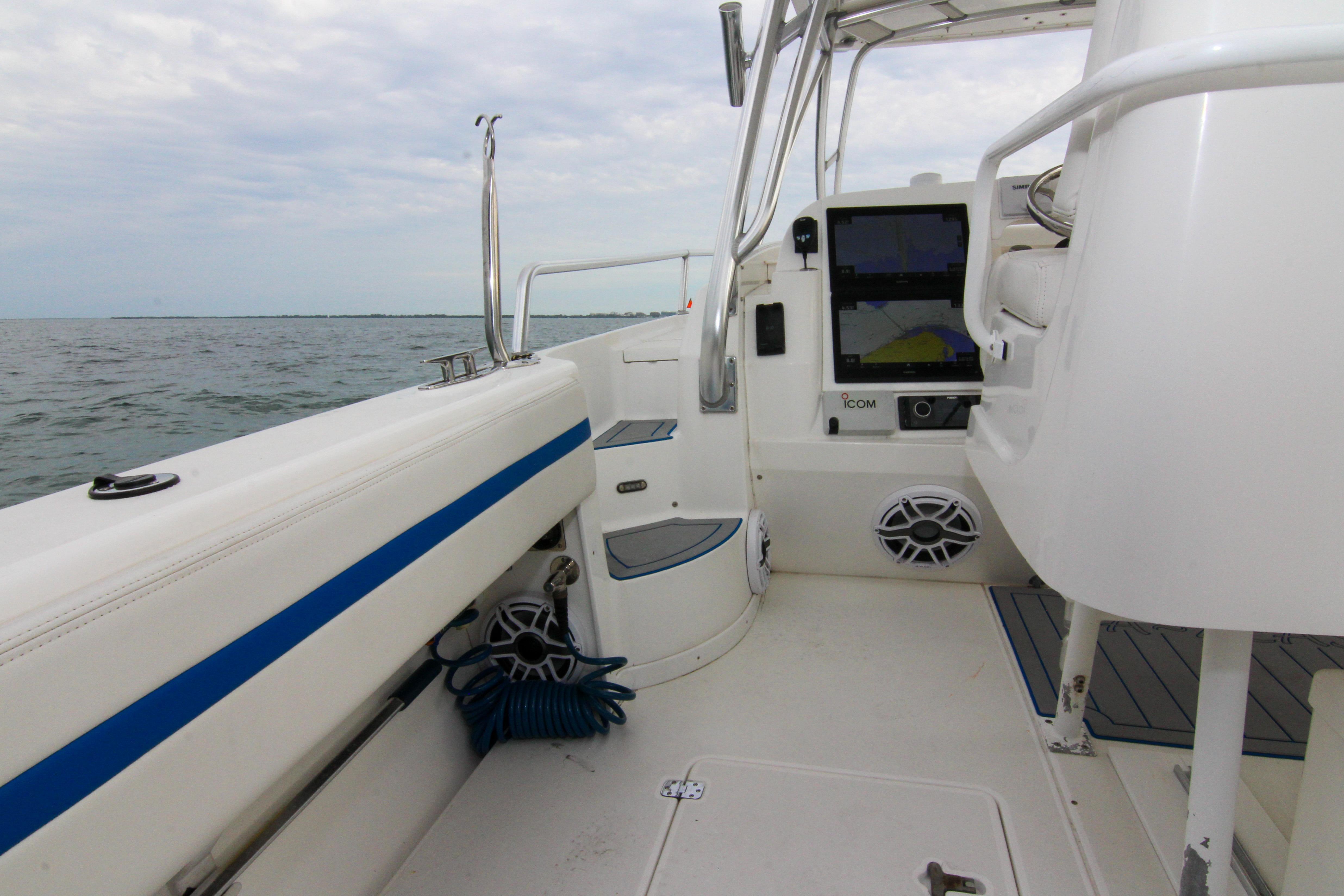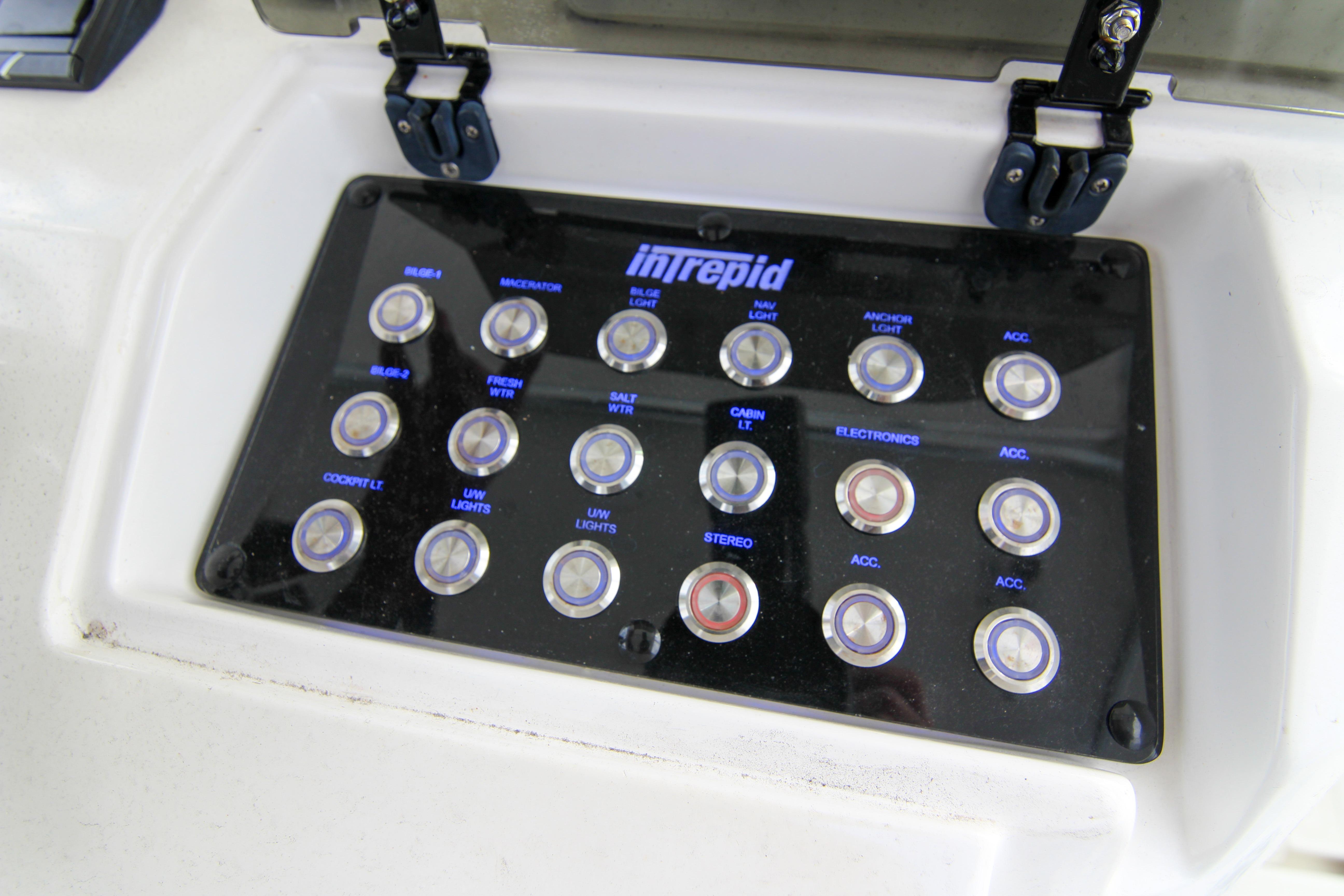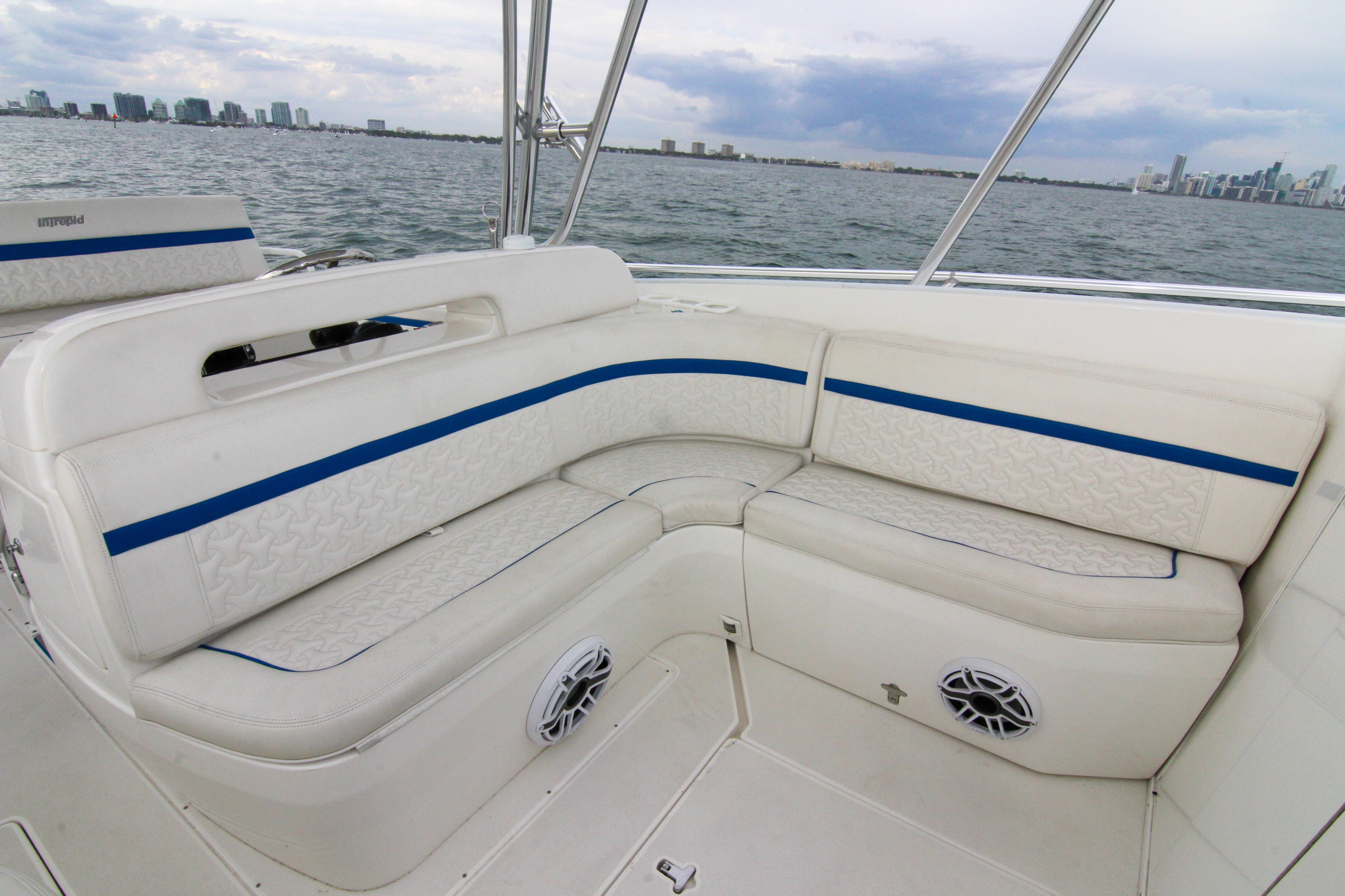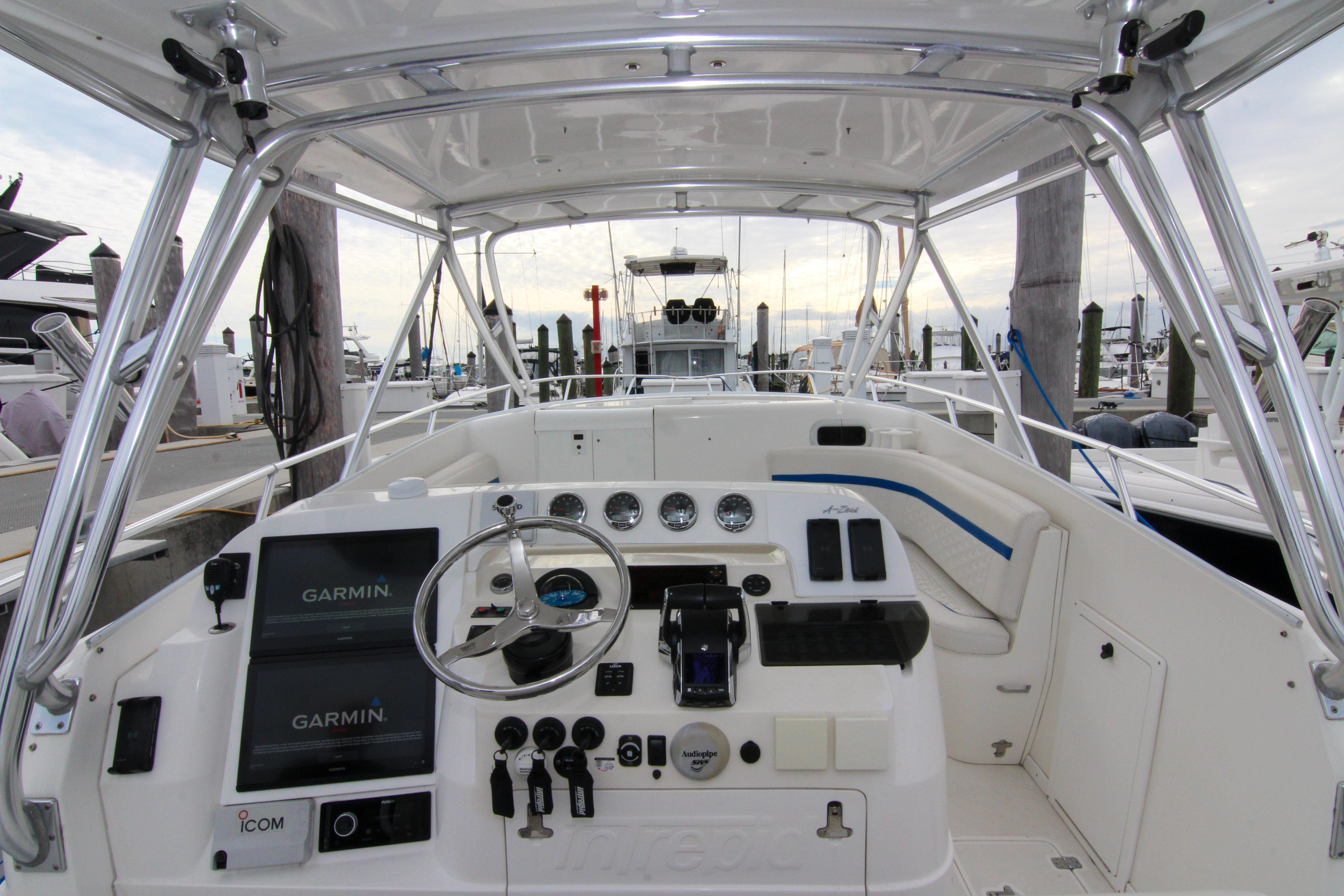 Stepping aboard, the walkaround design immediately impresses with its wide side decks and unobstructed pathways from bow to stern, allowing for safe, easy movement even when the seas get sporty. The cockpit is a fisherman's dream, equipped with deep fish wells, a transom door for easy access to the water, dual dive platforms, and an integrated boarding ladder. Removable aft lounge seating transforms the space from a hardcore angling arena to a social hub for entertaining guests. But it's the forward-thinking upgrades that make this Intrepid shine in today's market. The helm station has been fully modernized with updated electronics, centered around a Garmin 8416 touchscreen multifunction display. This 16-inch powerhouse integrates GPS charting, radar, sonar, and engine data into a user-friendly interface, ensuring precise navigation whether you're chasing tuna offshore or exploring hidden inlets. Complementing the Garmin is a robust bow thruster, which provides pinpoint maneuverability in tight marinas or when docking against crosswinds. An advanced autopilot system takes the fatigue out of long passages, holding course with unwavering accuracy, while integrated night vision capabilities extend your adventures into the evening hours, illuminating potential hazards and enhancing safety during twilight cruises.
