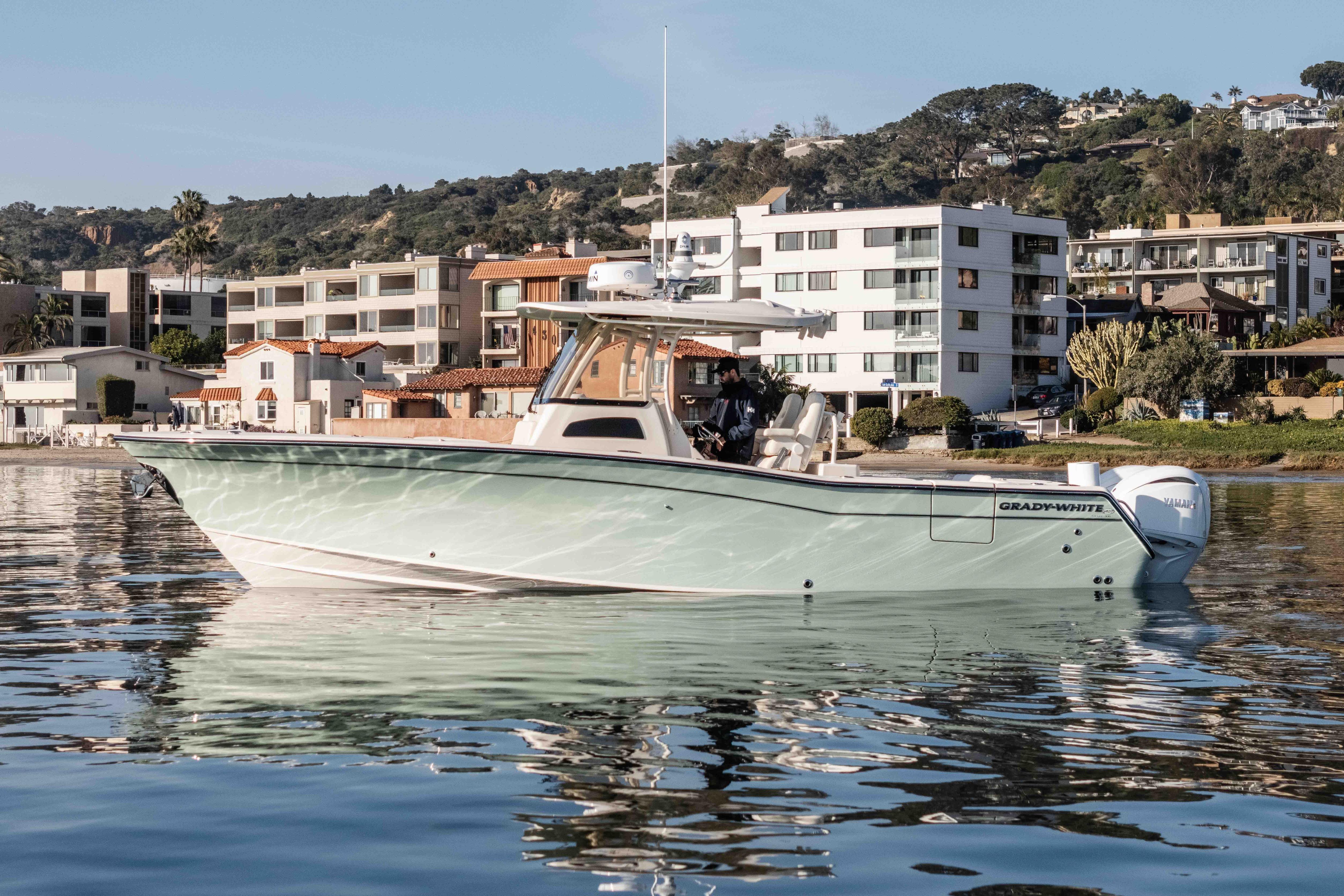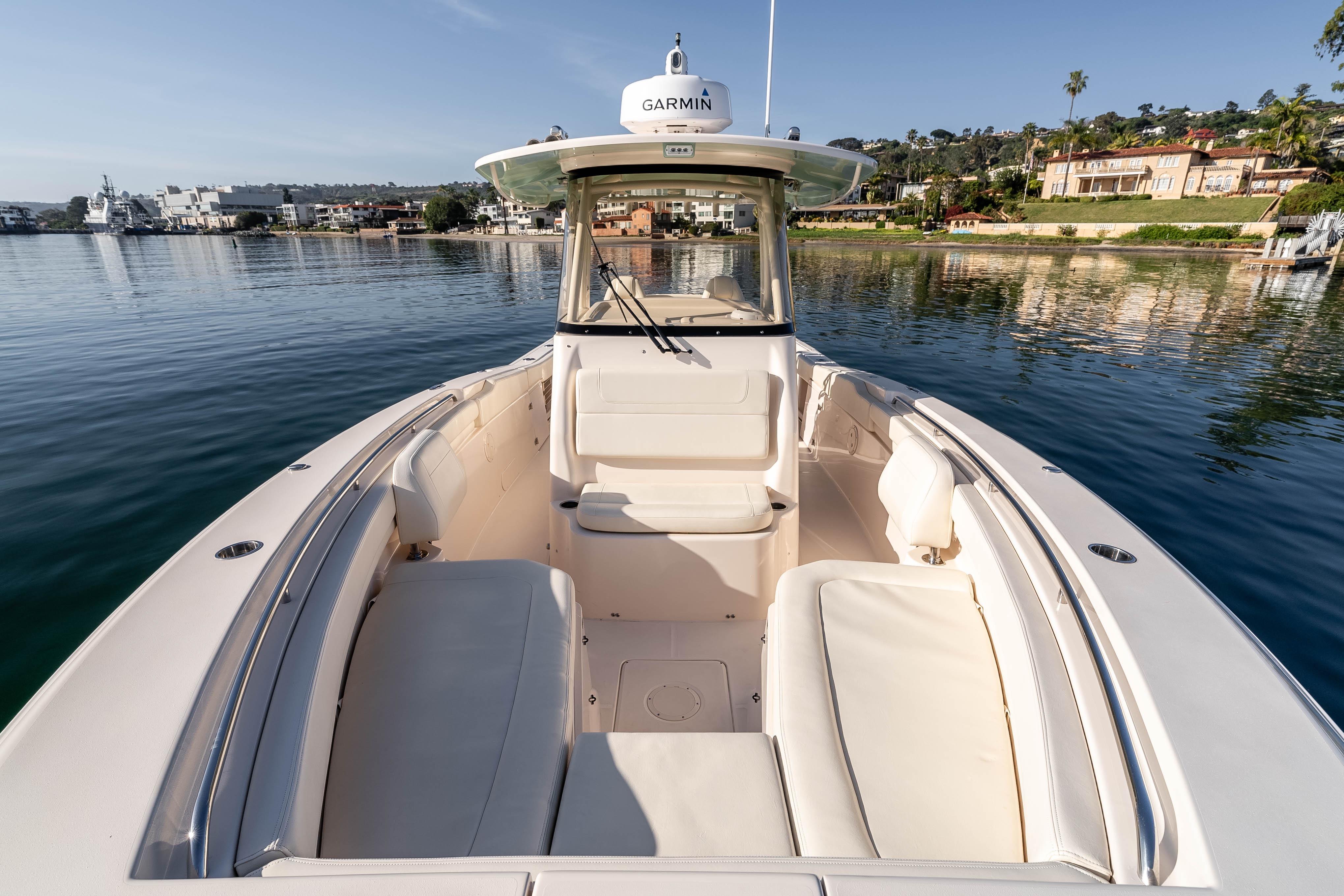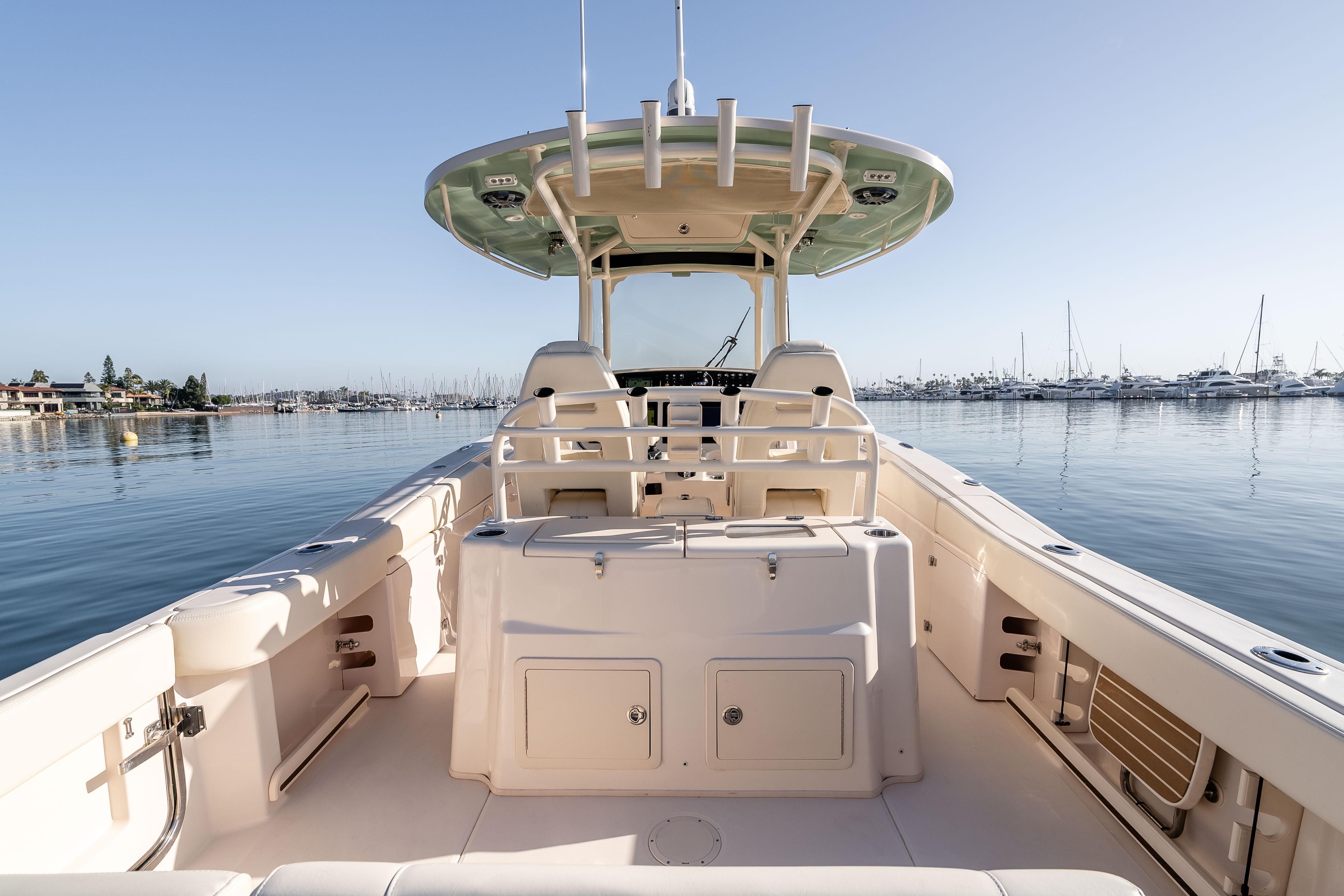 The boat is currently docked at the Kona Kai Marina in San Diego, contact the listing agent for more details. Engines are warrantied until April 2028.