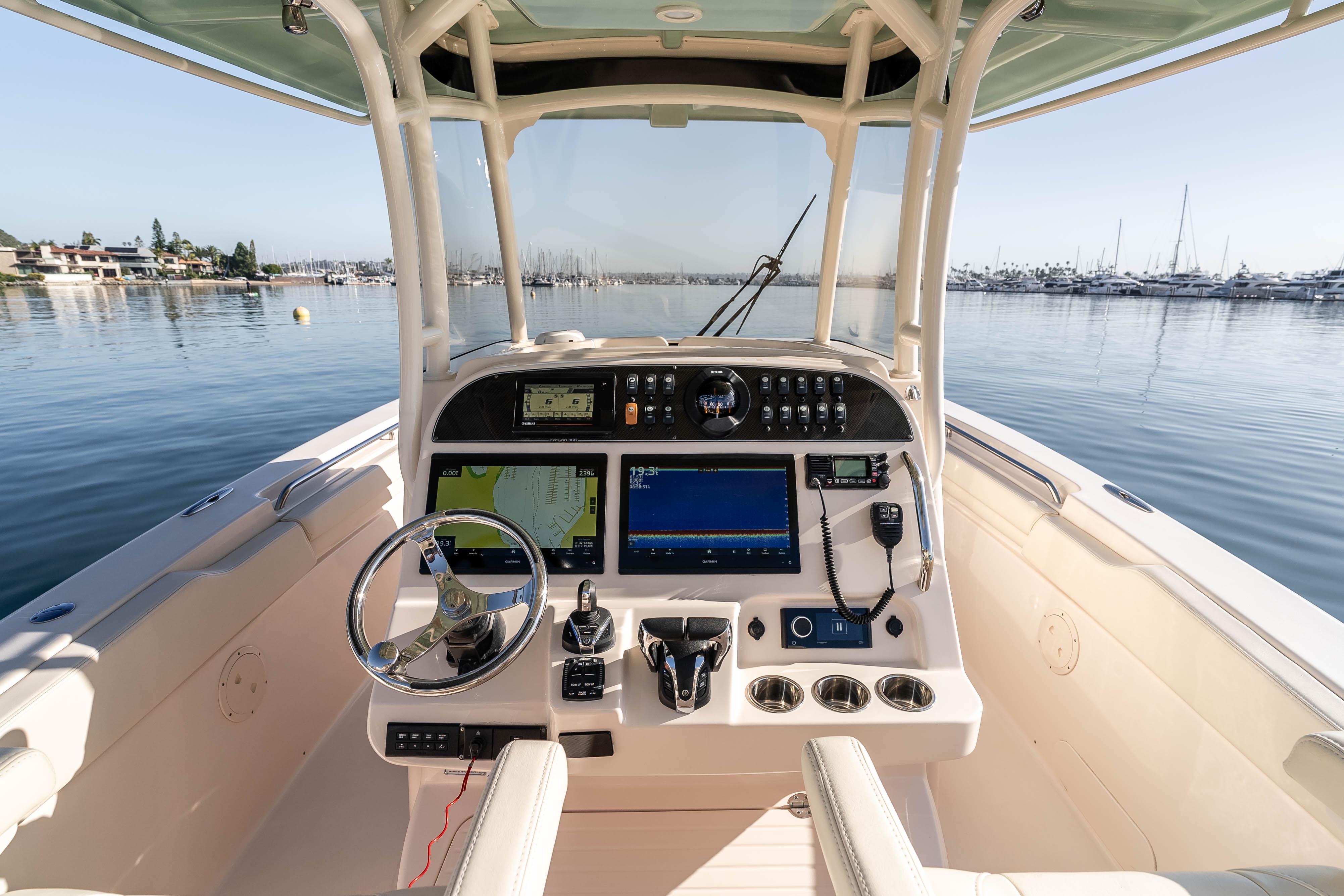 She is powered by twin Yamaha 300's with only 244 hours of use, and is equipped with Yamaha autopilot and joystick. At the helm you'll find a full suite of Garmin electronics, including a radar, along with a FLIR thermal camera. This boat also has the upgraded Fusion stereo system, along with Gemlux carbon fiber outriggers.